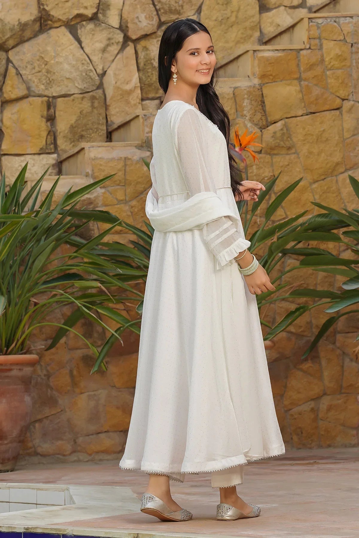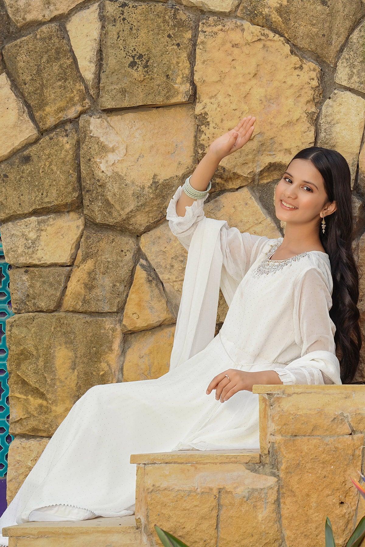 Top: White Foil Printed Georgette Maxi with Hand Adda Work, Tassel Belt and Malai Crepe Lining