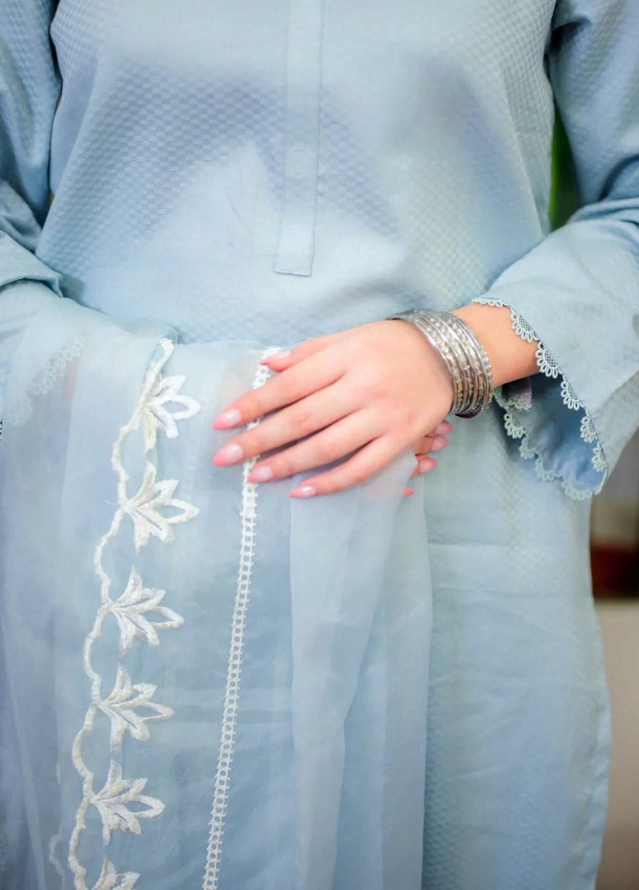 Introducing our exquisite Eid Collection, featuring a stunning blue kurta suit that embodies elegance and grace. This beautifully crafted ensemble is designed for the modern woman who appreciates both style and comfort. The kurta, adorned with intricate embroidery and delicate embellishments, flows gracefully, providing a flattering silhouette that enhances the wearer's natural beauty. Paired with matching trousers, this outfit is perfect for festive gatherings and celebrations, making it an ideal choice for Eid festivities. The living room setting in the image highlights the versatility of the kurta suit, showcasing its ability to transition seamlessly from casual family gatherings to more formal occasions. Elevate your wardrobe with this timeless piece that reflects cultural heritage while embracing contemporary fashion trends.