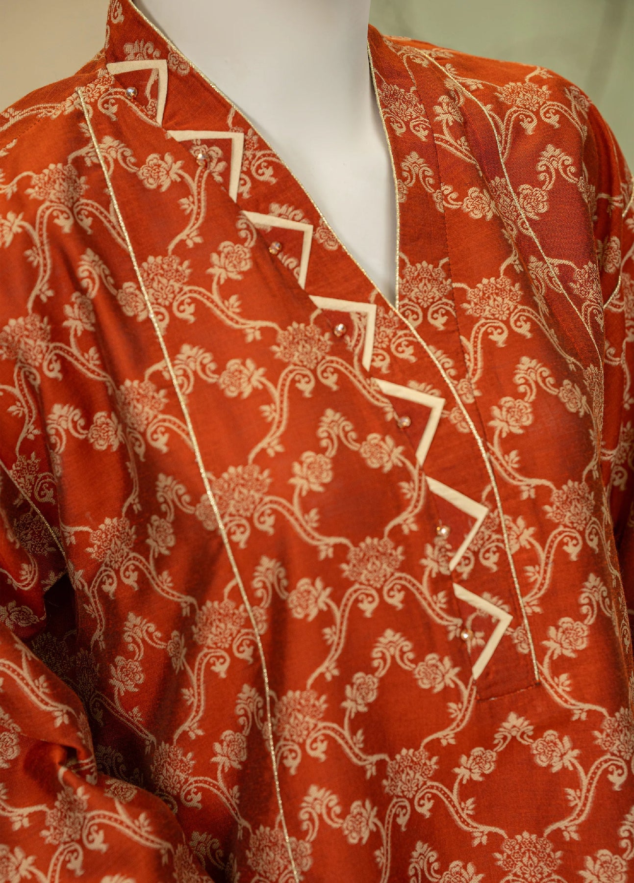 A refined rusty two-piece set featuring a relaxed-fit kurta with an intricately detailed neckline. Paired with a stylized loose shalwar, this ensemble perfectly balances effortless comfort with understated elegance.