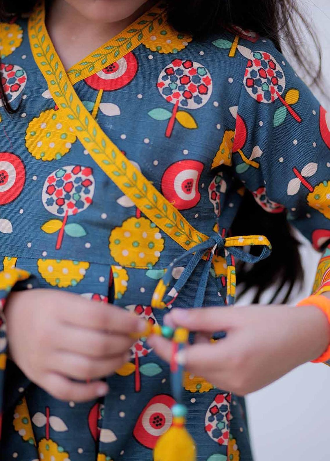 Angharka style pleated frock finished with contrasting printed border on shirt sleeves and bottoms Embellished with handmade fabric dori Paired with stylish bottoms and printed dupatta br data mce fragment 1