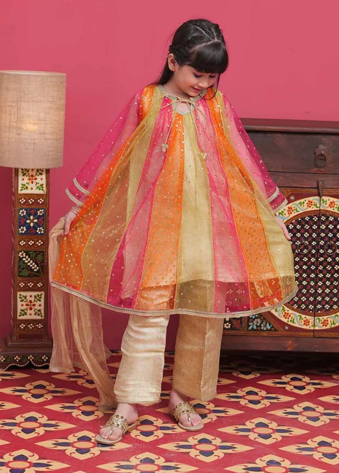 Multicolor embellished A line kalli frock Finished with gold lace on the neckline sleeves daaman and trouser Embellished with fancy dori on the neckline Paired with straight pants and dupatta