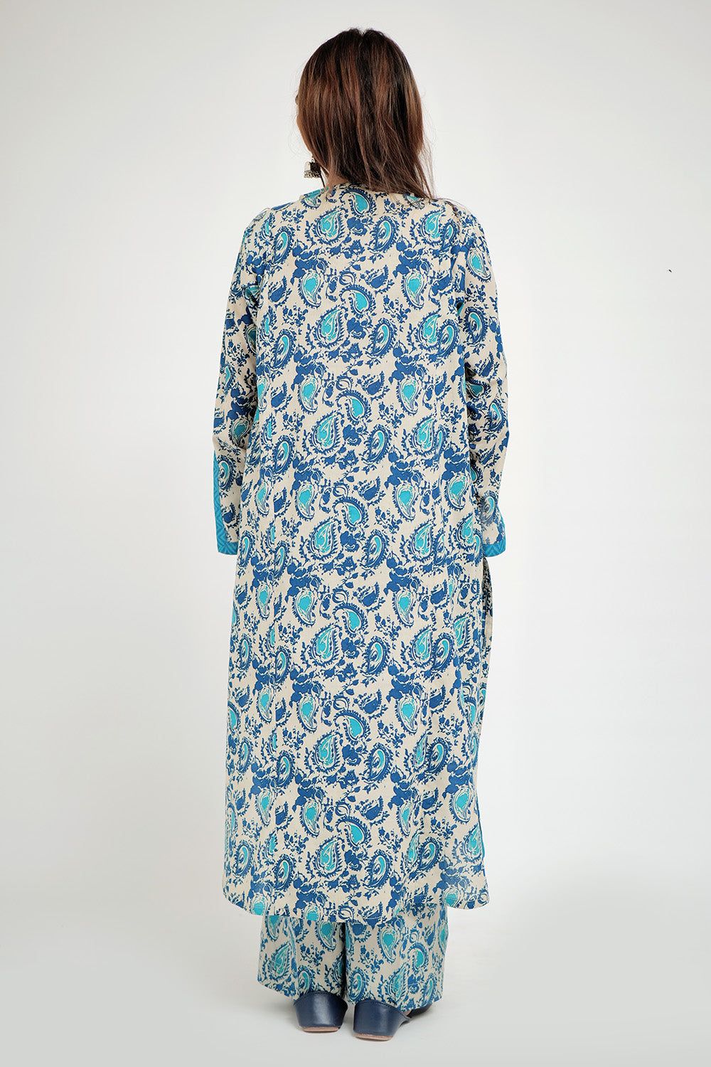 Straight cut shirt with border finishing all around stylish sleeves with slit paired with loose cut pants.