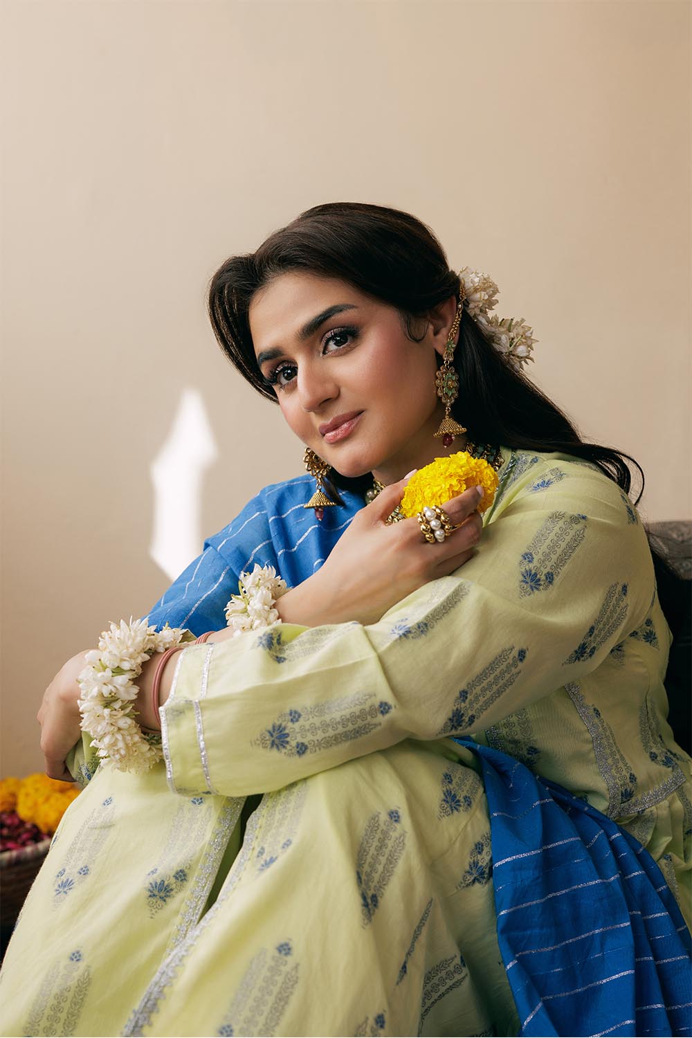 "Front open A line panelled shirt, with fancy embroidery, lace, and embellishments. Paired with flared pants and contrasting fancy dupatta.