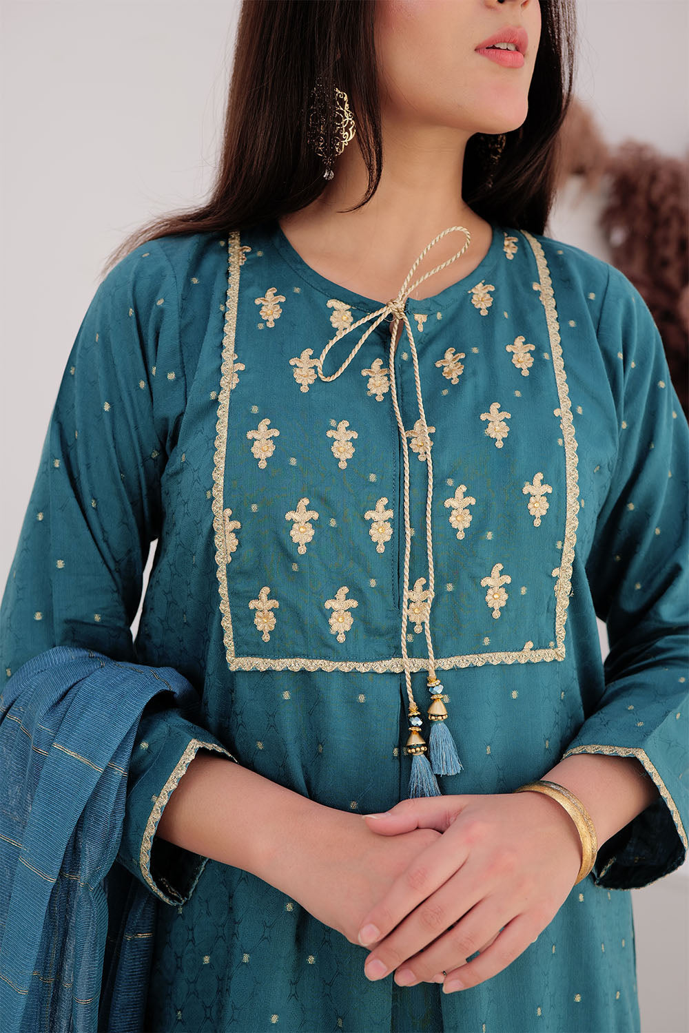 "Straight shirt, having fancy embroidery and tassel dori. Paired with straight pants and fancy dupatta".