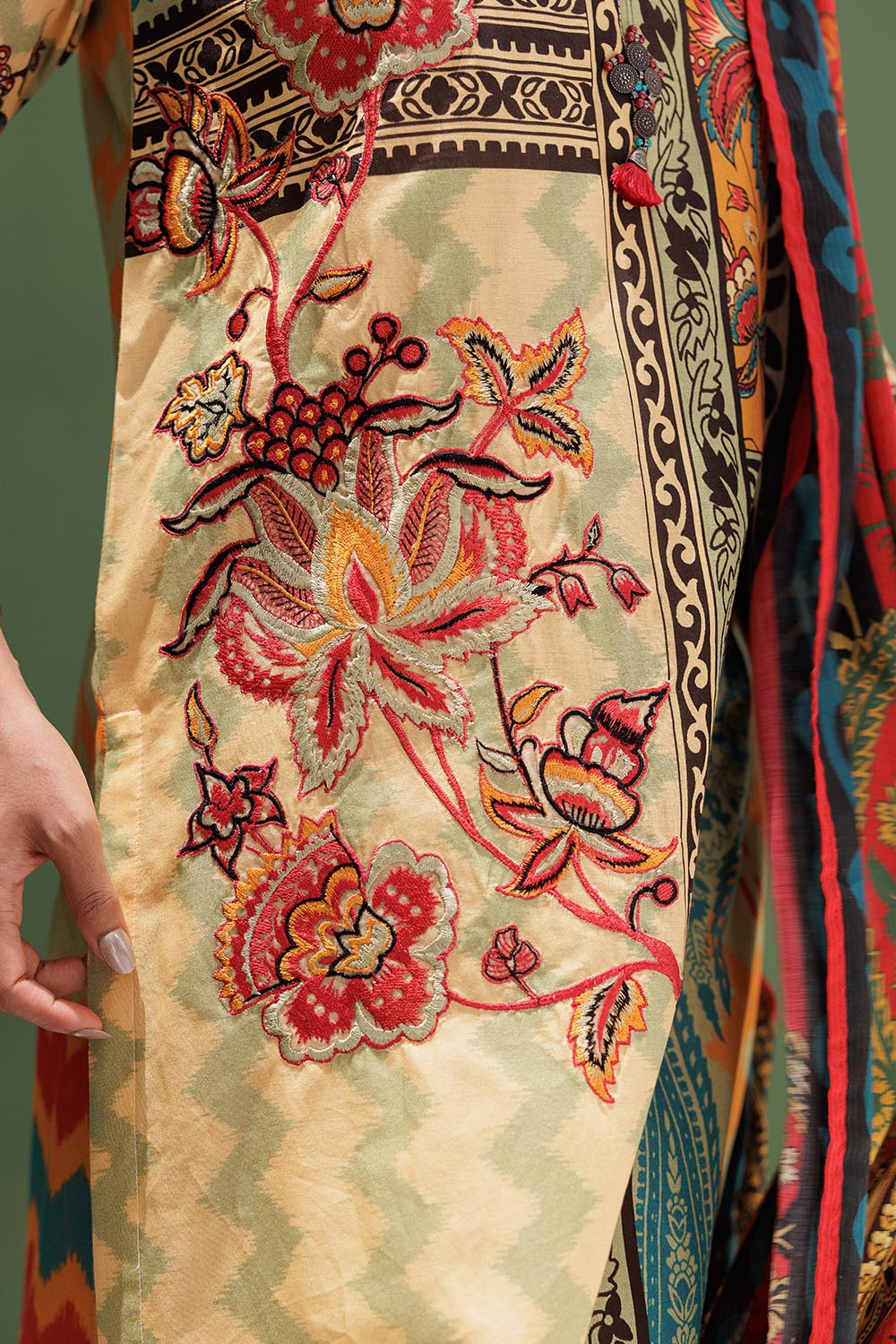 Straight shirt with embellishment around neckline and embroidered patch on front paired with straight loose pants and printed duppatta.