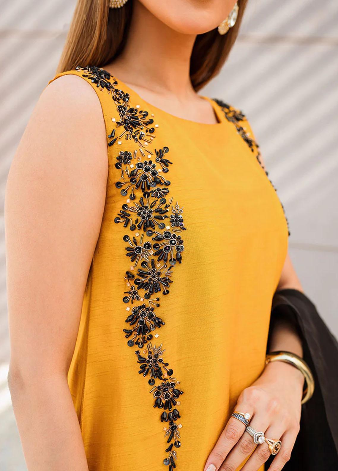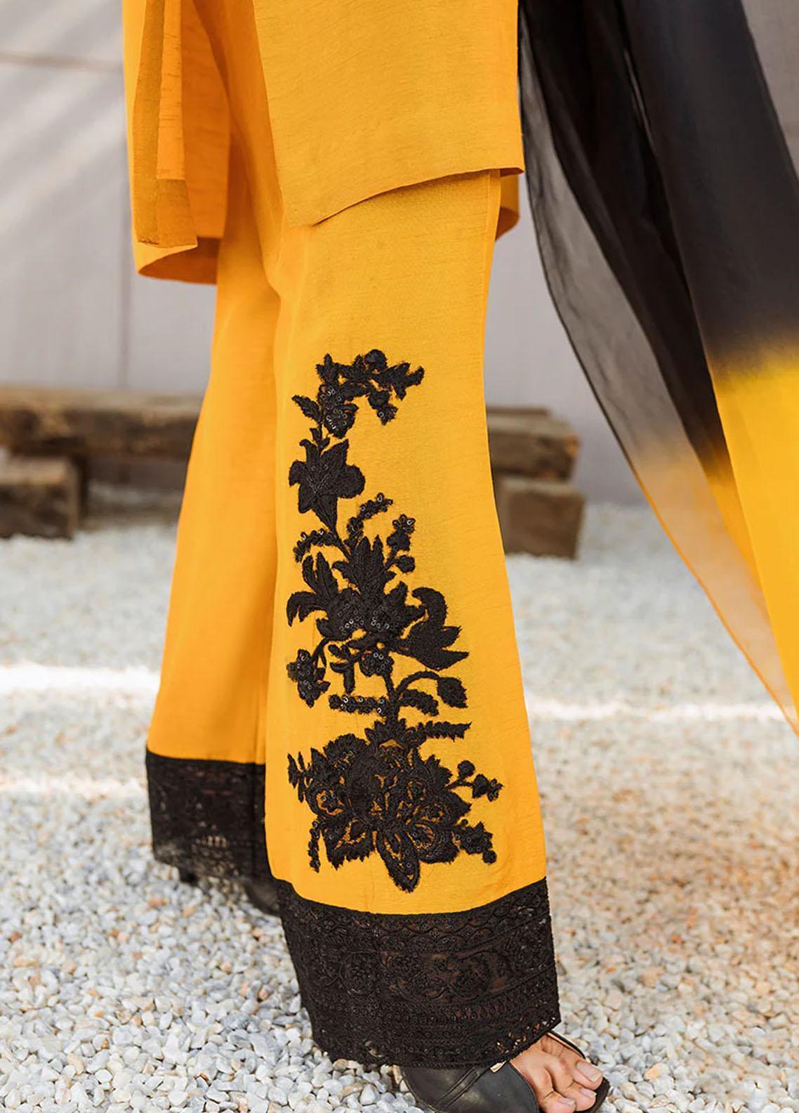 This is a 3 piece stitched outfit Shirt Trouser and Dupatta.Dreamy and ethereal outfit this mustard raw silk shirt and trouser comes with an organza dupatta. The shirt is adorned with delicate adda work. The trouser with embroidered patch work adds to the ode of this ensemble. The organza dupatta is dyed on ombre black and mustard and is laced up with delicate edging. This remarkable piece is bound to make you the center of attention.