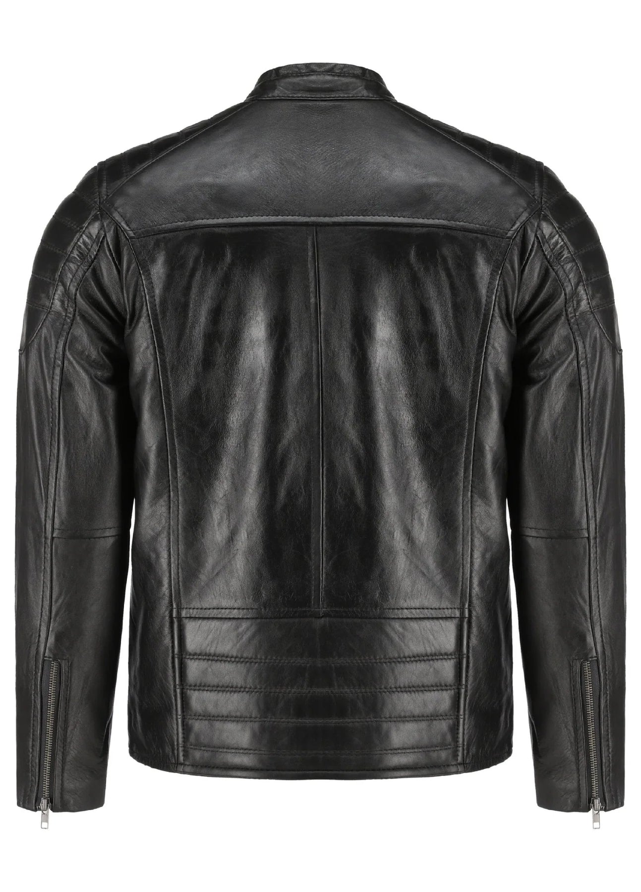 This black lambskin leather jacket is an ultimate trendsetter. It comes with a simple and classy design and features, front zip fastener, front zip pockets, snap button collar, and a modern fit.