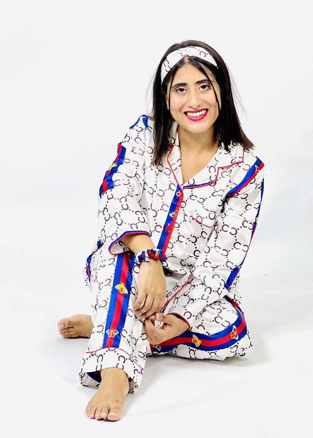 2 Pcs Digital Print Pajama Set With Hairband , Eye Mask & Scrunches