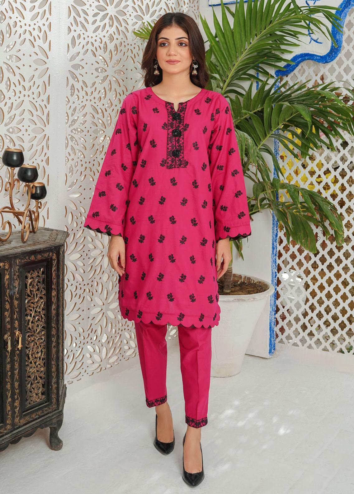 2 Piece Embroidered Cotton Suit A two-piece coral pink dress with grace and elegance. It is a stylish shirt with a floral embroidery in black. matched with a pair of trousers. This attire is an excellent choice for festive season celebrations.