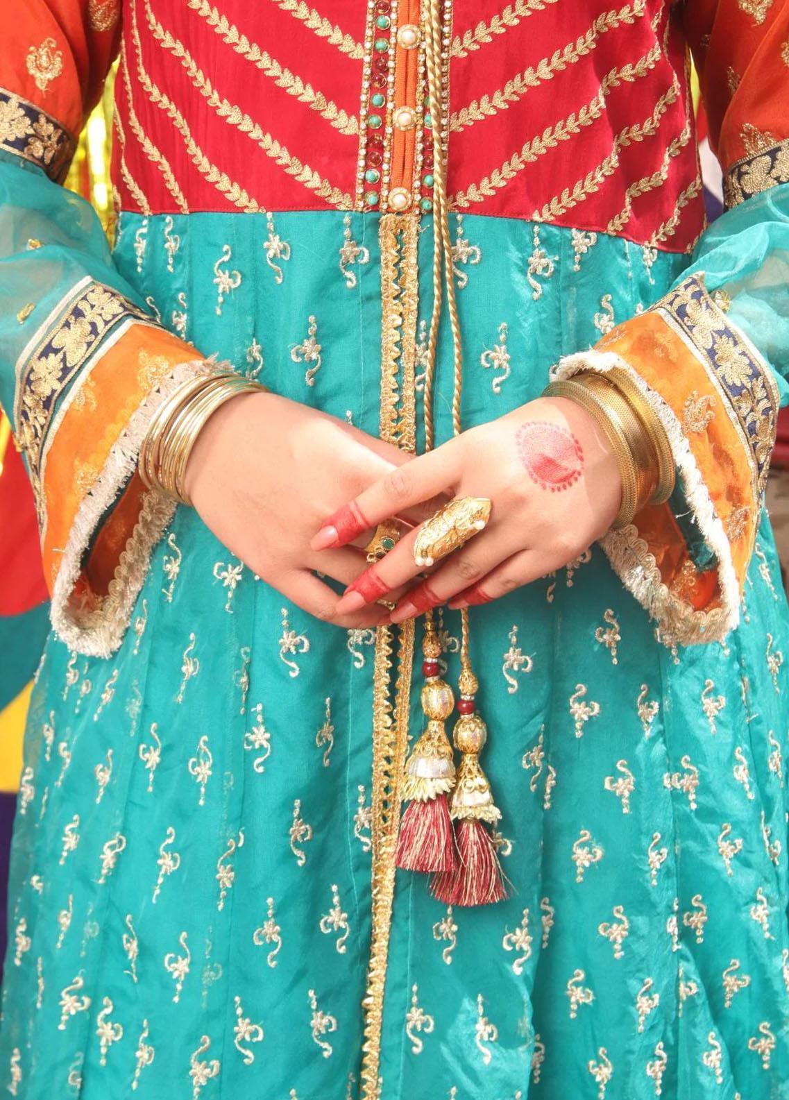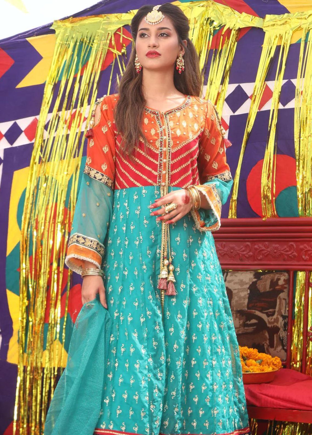Front open style shirt with contrast heavy embroidered bodice and sleeves lace detailing on ghair Paired with gharara and dupatta