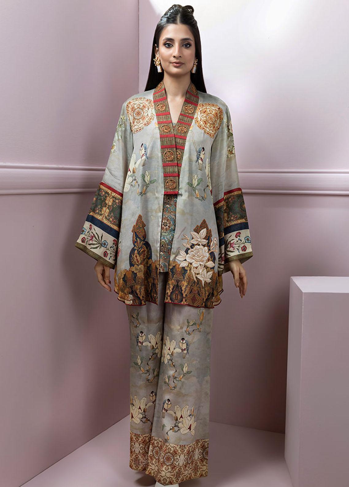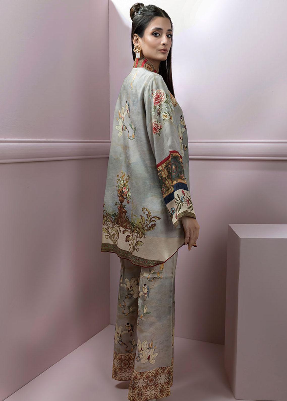 Glamourize the grace with this blend of hues in lightest gray, floral printed shirt featuring delicate pearls, laces and ivory florals. Comes with printed trouser, inner and belt. Bag can be added seperately as per customer request.
