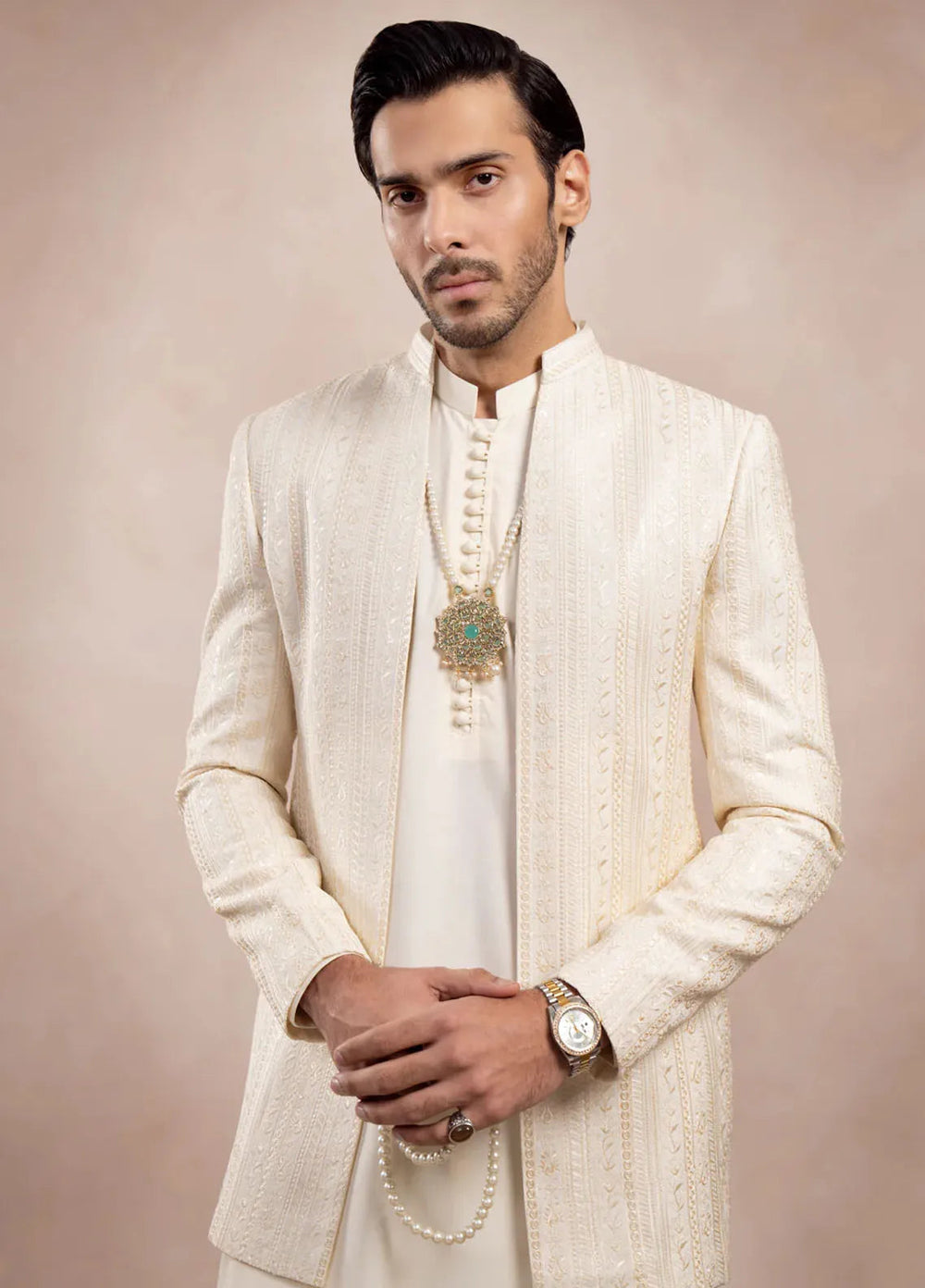 Muraqsh Raw Silk Embroidered Mens Open Prince Coat - Cross Stitched
