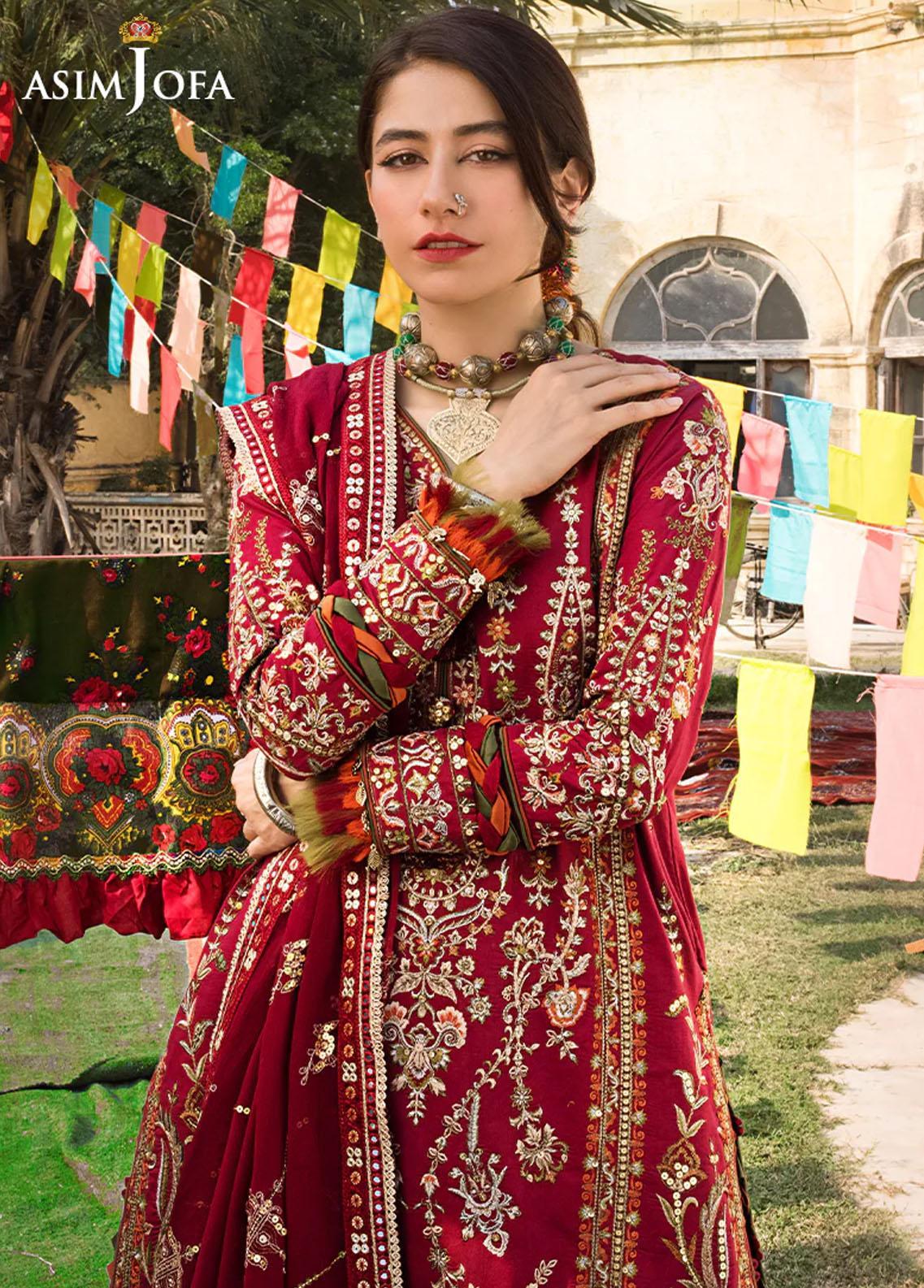 Nailing this traditional look to perfection Syra Yousuf fits perfectly in this colorful background. Intricate embroidery decorates the rich red base worked with glinting 5mm sequins adding the bling to this stunning composition. Deep red embroidered chiffon dupatta and dyed pants rounds off this bold look. Accessorize with chunky tribal jewelry to complement this look.