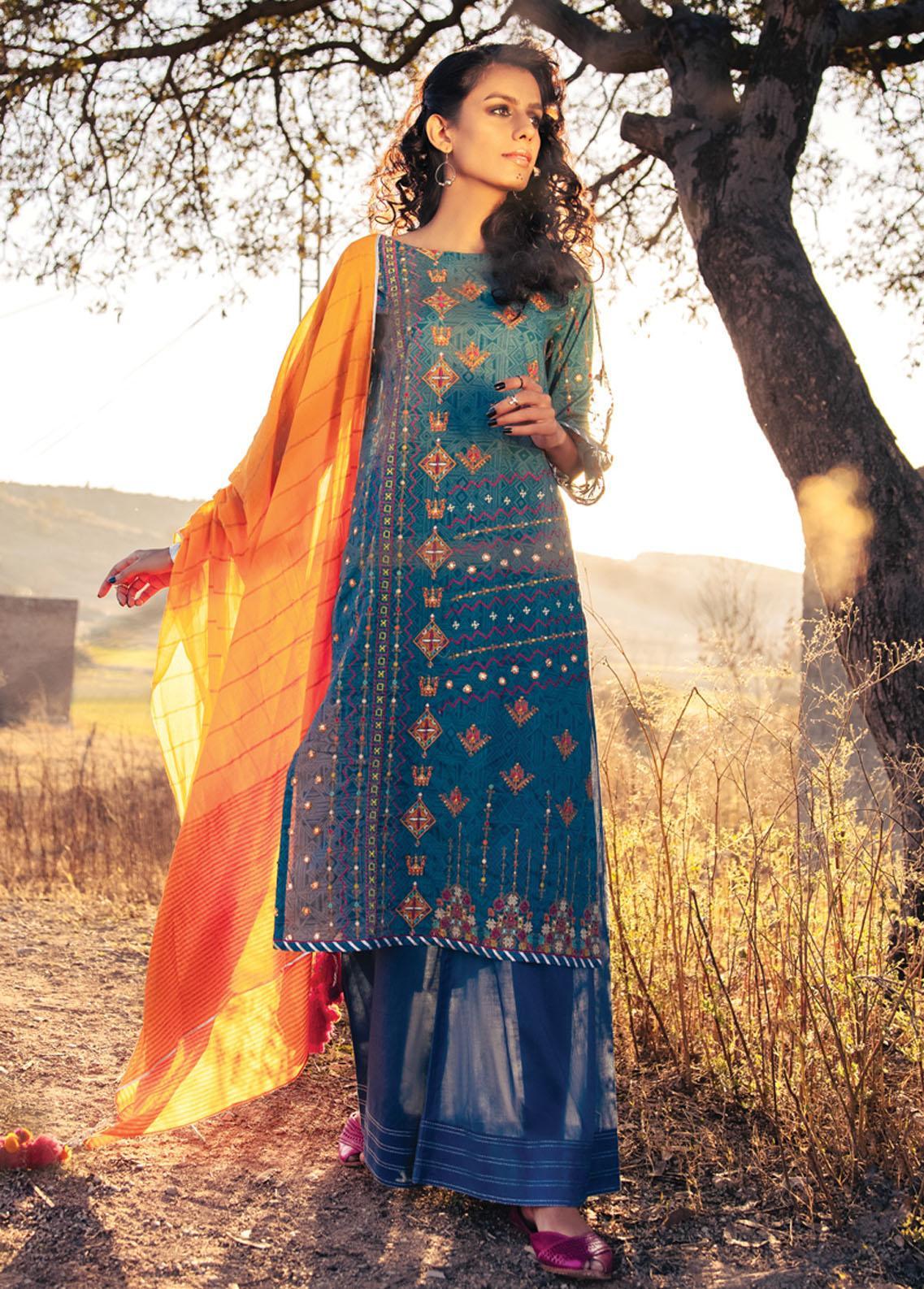 Fabric: Lawn Color: Teal With Mustard Dupatta Work: Embroidered Shirt Front: Printed Embroidered Lawn 01 Piece Shirt Back: Printed Lawn 01 Piece Sleeves: Printed Embroidered Lawn 01 Pair Dupatta: Pearl Printed Dobby Net 01 Piece Trouser: Dyed 01 Piece