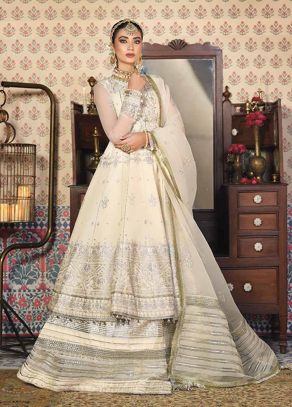The final look in an ivory color captures the grandeur of everything a formal must-have. This gorgeous Pishwas features skillfully placed zari and thread with sequins and sitara embellishments with a classic neckline that sparks understated elegance. The hemline is embellished with intricate designs and shimmering sequins and sitaras. Borders running along the hemline are also adorned with lavish details making this dress an epitome of beauty. It comes with cotton silk trousers and a traditionally embroidered dupatta gives this design the festive vibrancy it deserves to be a showstopper.