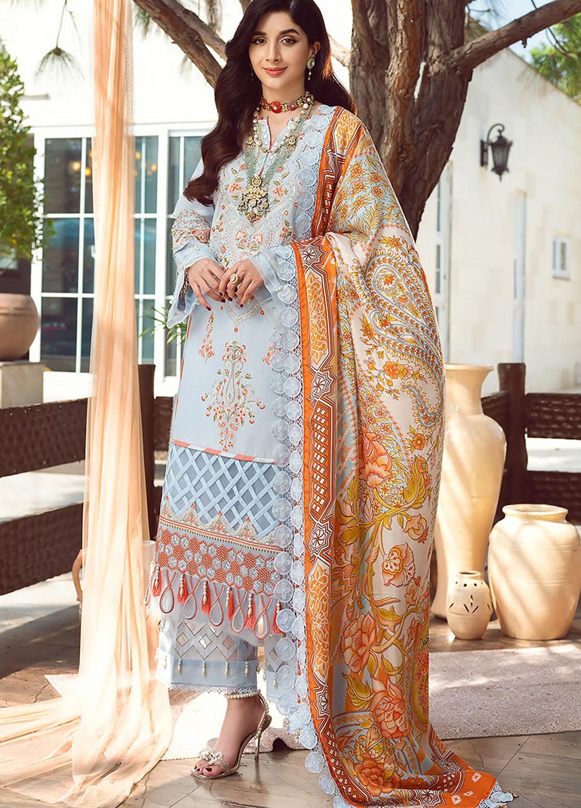 Printed Dupatta (Pure Medium Silk) - 2.50 Meter Embroidered Shirt Front Center Panel (Pima Lawn) - 01 Piece Embroidered Shirt Front Right Panel (Pima Lawn) - 01 Piece Embroidered Shirt Front Left Panel (Pima Lawn) - 01 Piece Embroidered Sleeves (Pima Lawn) - 01 Meter Dyed Shirt Back (Pima Lawn) - 1.25 Meter Embroidered Front Hem Border (Organza) - 01 Meter Dyed Trouser (Cotton) - 2.50 Meter