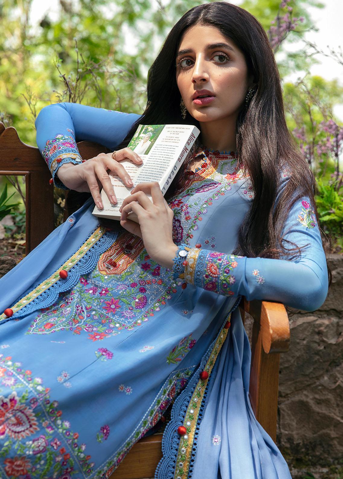 Beguiling ombr sky hued lawn is adorned with minutely detailed shadow work taankas in shades of cream, periwinkle, mauve and cranberry. Beautifuly sewn with mirrors to create a festive composition; Mehr is Inspired by aged Bahawalpuri traditions of craftsmanship and is complemented with a dupatta artistically sewn stitch by stitch with indigenous elements. A striking block printed shalwar, pulls together this timelessly classically nuanced and culturally rich design.