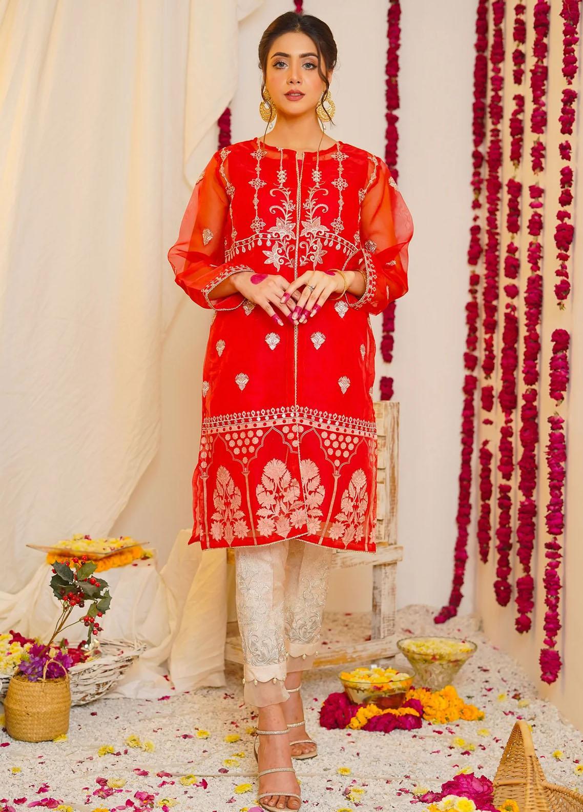 This dazzling red design is a must-have for the summer. Tilla work on the hem of an organza shirt with a matching lining . Small embroidered motifs on sleeves to give it that wow factor.