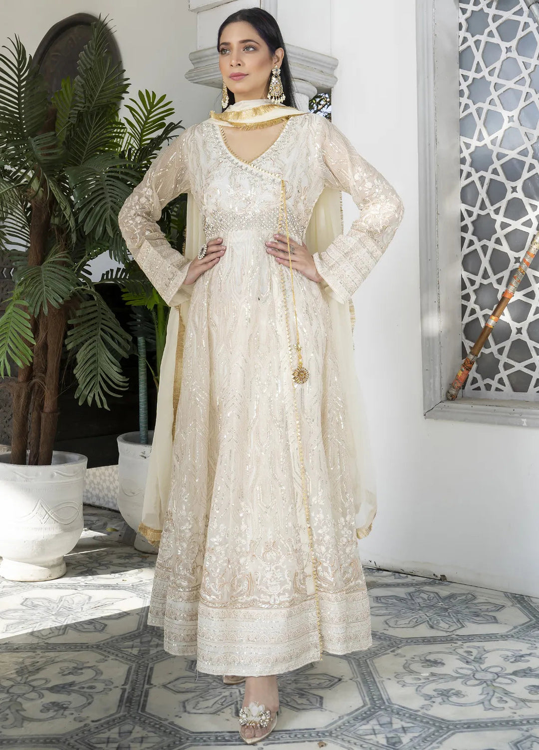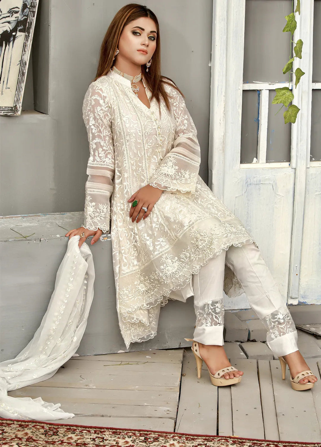 Mona Embroidery Pret Embroidered Chiffon 3 Piece Suit Shale-Off-White