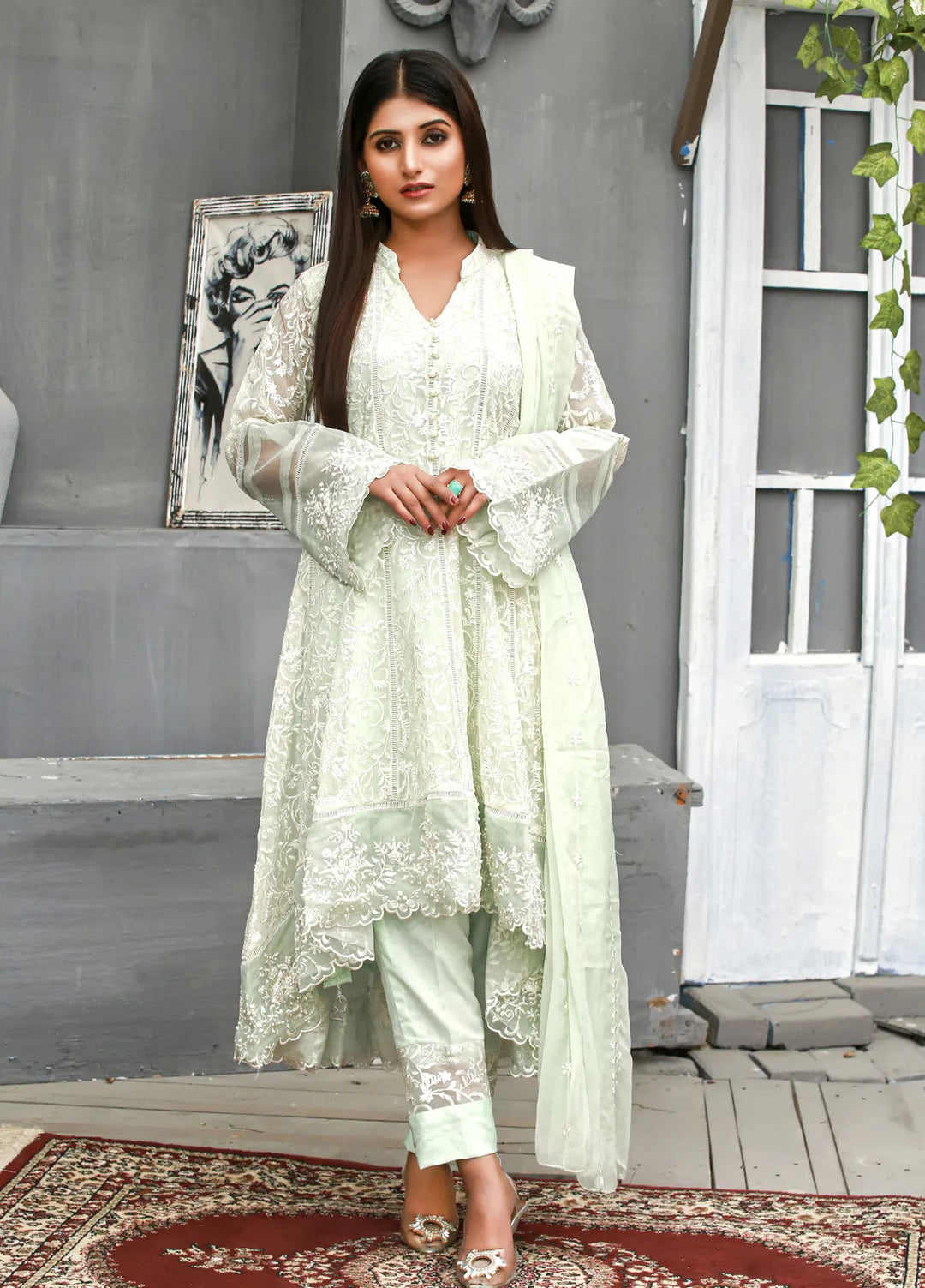 Mona Embroidery Pret Embroidered Chiffon 3 Piece Suit Dusty Affair-Mint-Green