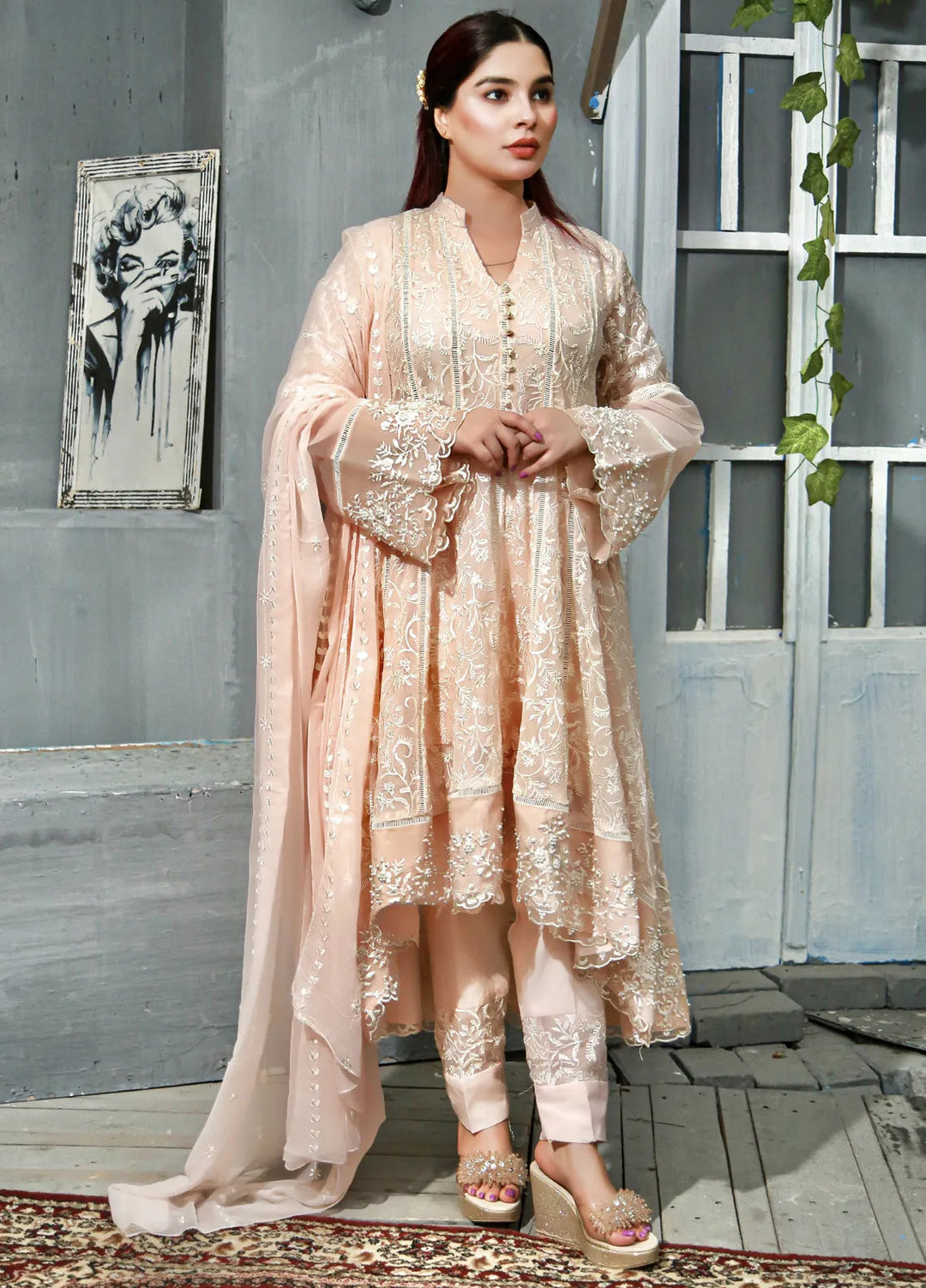 Mona Embroidery Pret Embroidered Chiffon 3 Piece Suit Shale-Peach
