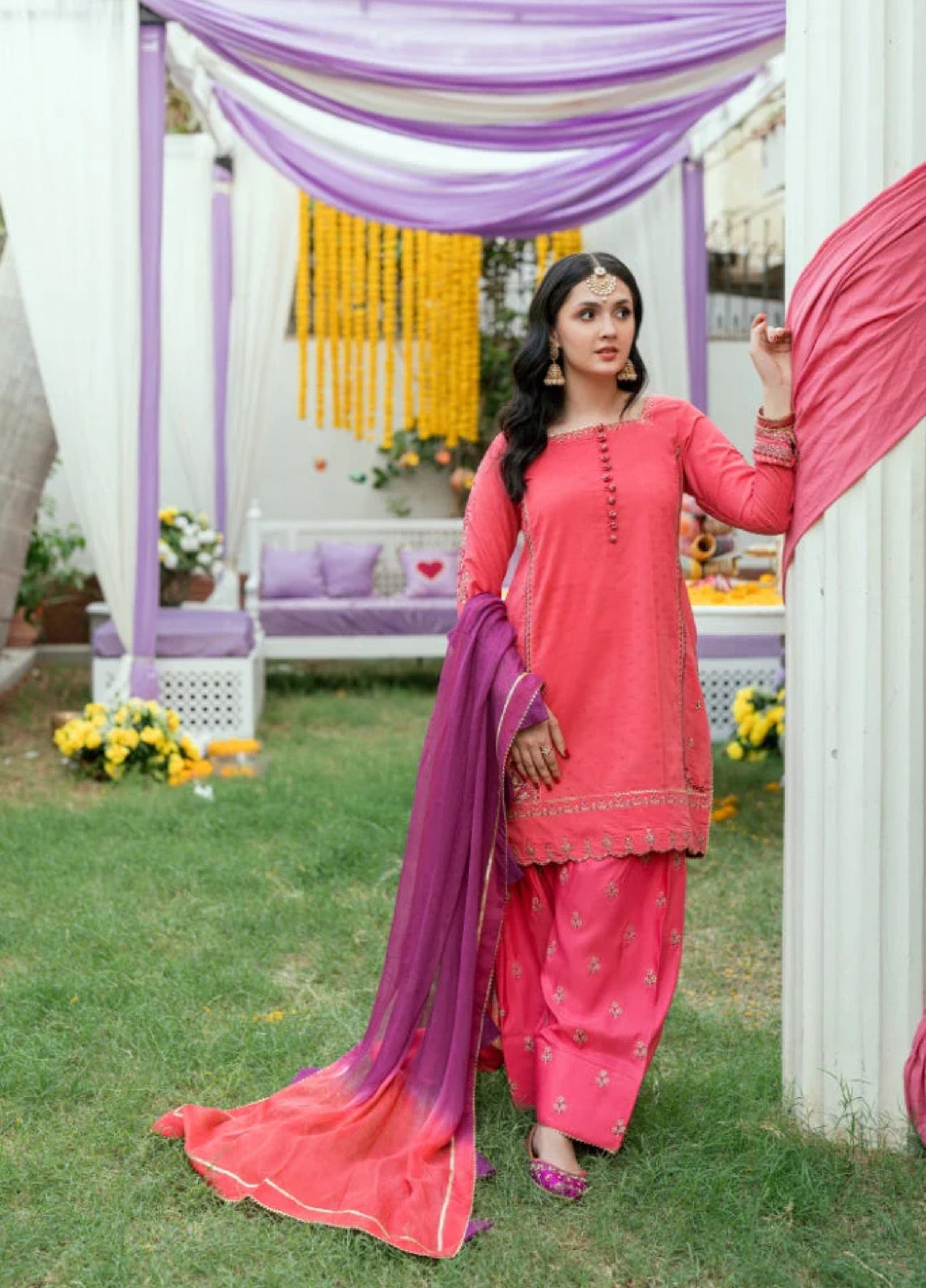 Color: Rose Pink Fabric of shirt: Dobby Fabric of dupatta: Chiffon Fabric of trouser: Raw silk Model Height: The model is 5'5 and wears a small size.