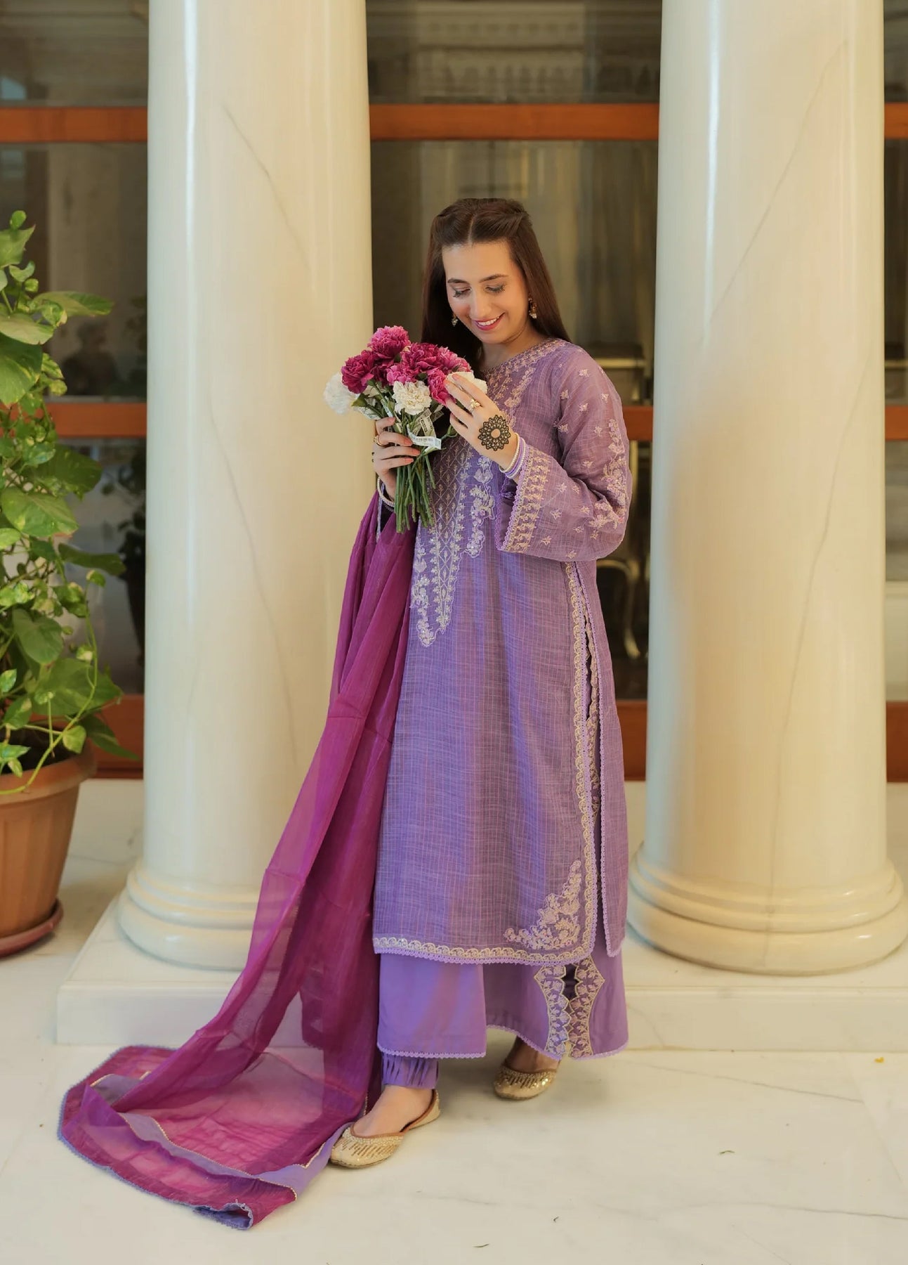 Color: lavender Fabric of shirt: Munar line Fabric of dupatta: Maysuri Fabric of trouser: Cotton silk Fabric of inner: Malai Model Height: The model is 5'5 and wears a small size.