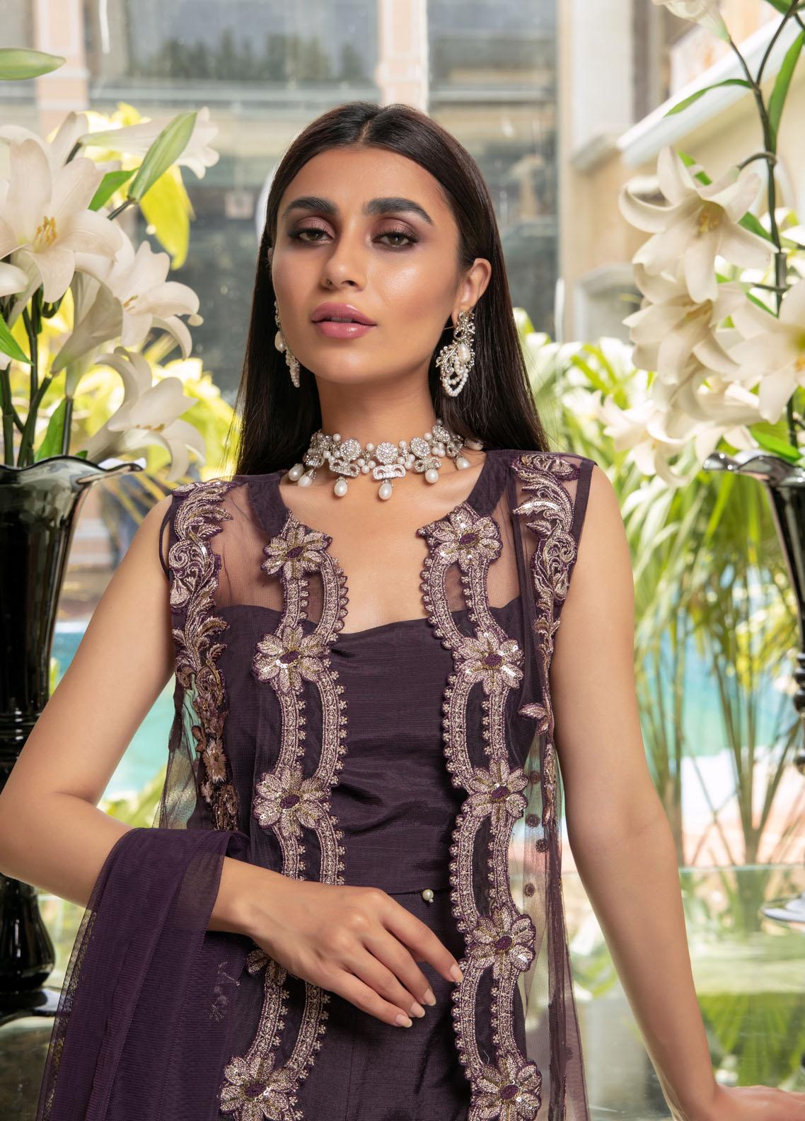 Inspired by French florals and filigree patterns the beautiful Dalia on a deep purple sheer net with shaded purple floral embroidery. The outfit is embellished with silver zari and sparkling sequins. The outfit includes matching purple colour raw silk fabric pants, a plain net fabric dupatta and beautiful zari borders. This combination and style is your go to when tradition meets modern aesthetics.