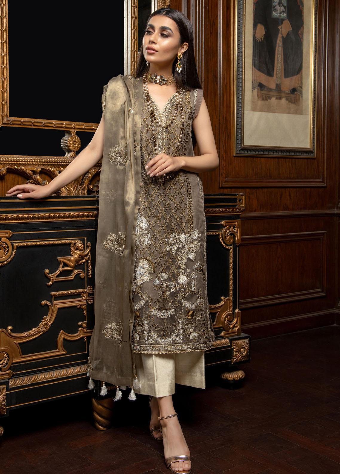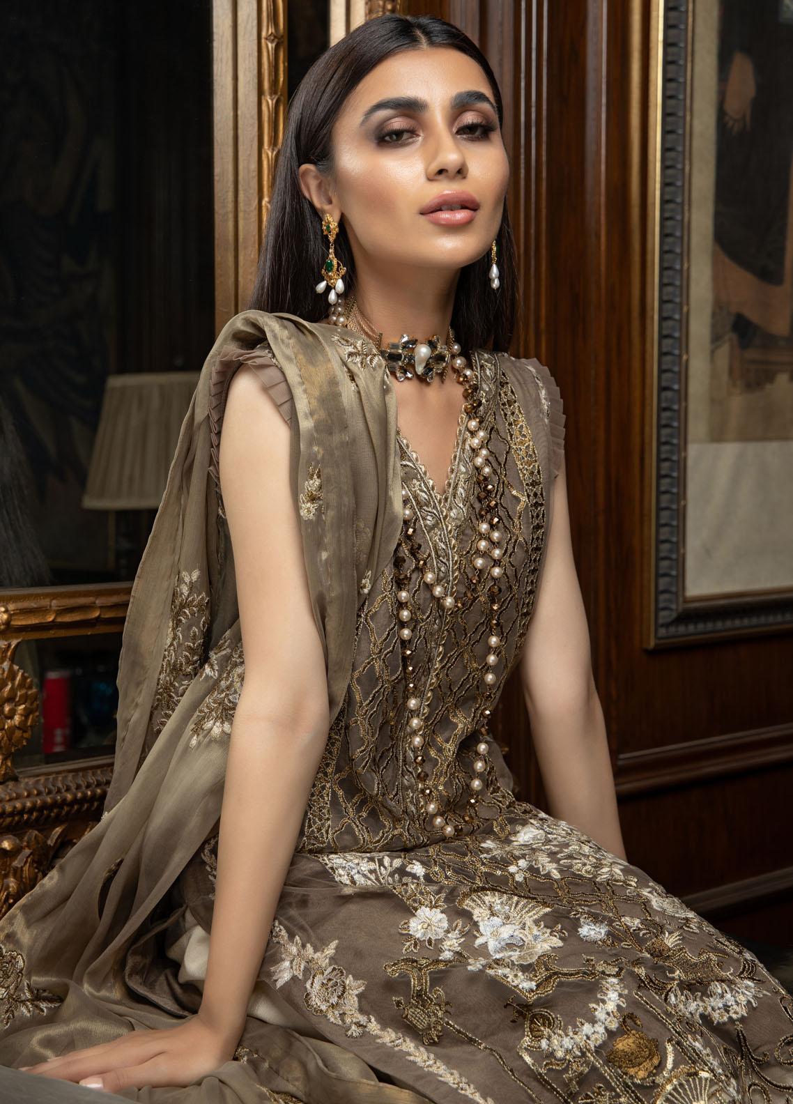 The elegant Elvan is a combination of summer blooms and antique hues. The outfit is on a sheer net fabric with shades of bronze and dull gold zari embroidery with accents of off-white florals in resham threads.This outfit has a beautiful floral embroidered vines at the back and comes with matching raw silk pants and a lustrous mesuri duputta embroidered with floral bunches.