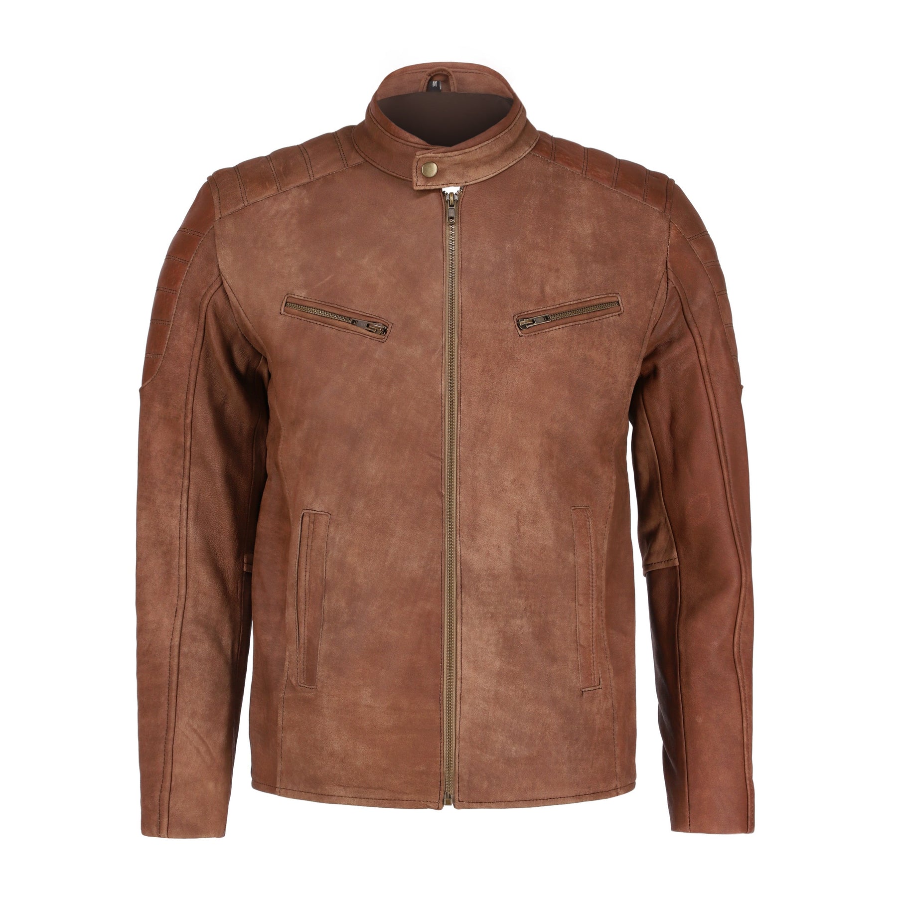 This brown leather jacket is an ultimate trendsetter. It comes with a simple and classy design and features, front zip fastener, front zip pockets, snap button collar, and a modern fit.