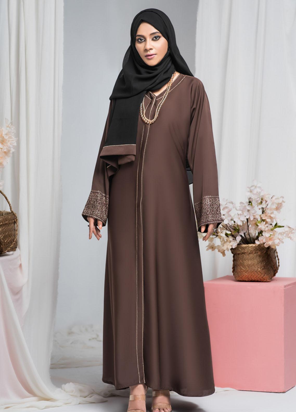 Beautiful Brown with Embroidery occasion wear abaya is designed in soft and breathable summary Nidah fabric with beautiful stunning embroidery at Sleeves making it super elegant chiffon hijab is included Fabric NIDAH Care 30 C Mild Wash Do Not Bleach Do Not Bleach Do Not Tumble Dry Cool Iron Professional DryClean
