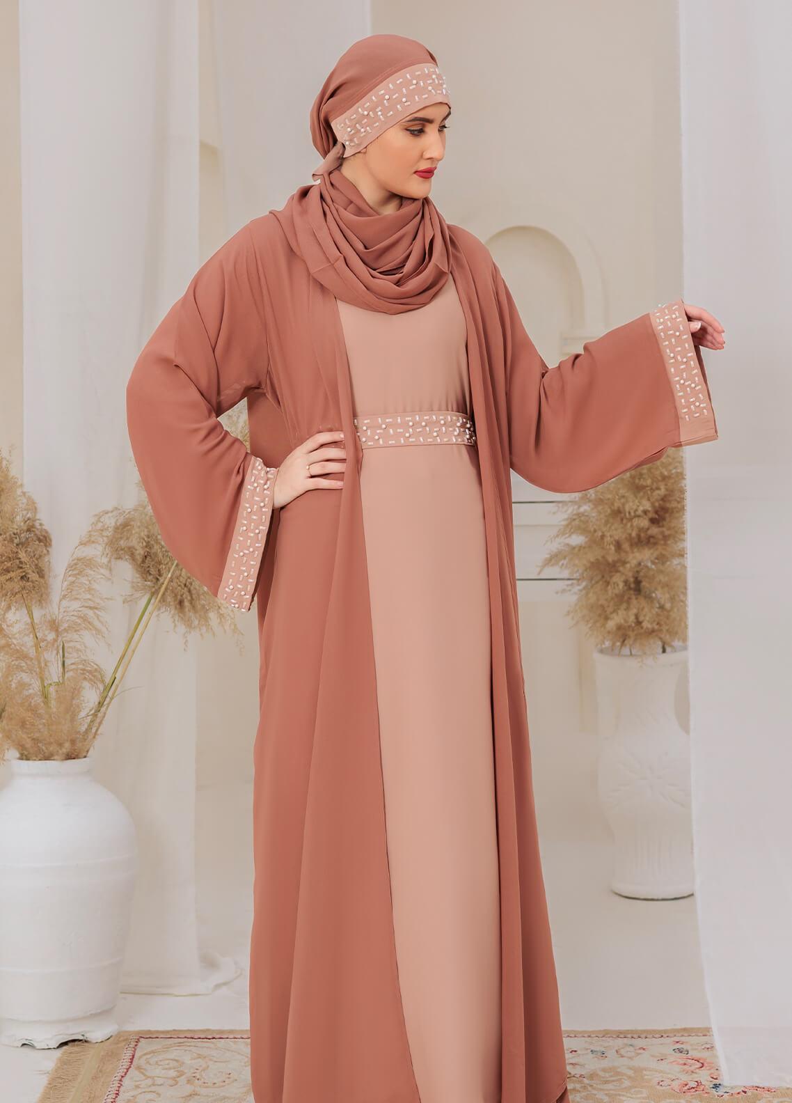 An aura of luxury, constructed on fine premium fabric coat style which is a hit code these days, with pearl work on cuffs with beautiful sleeves comes along with pure Korean dyed chiffon Sheila