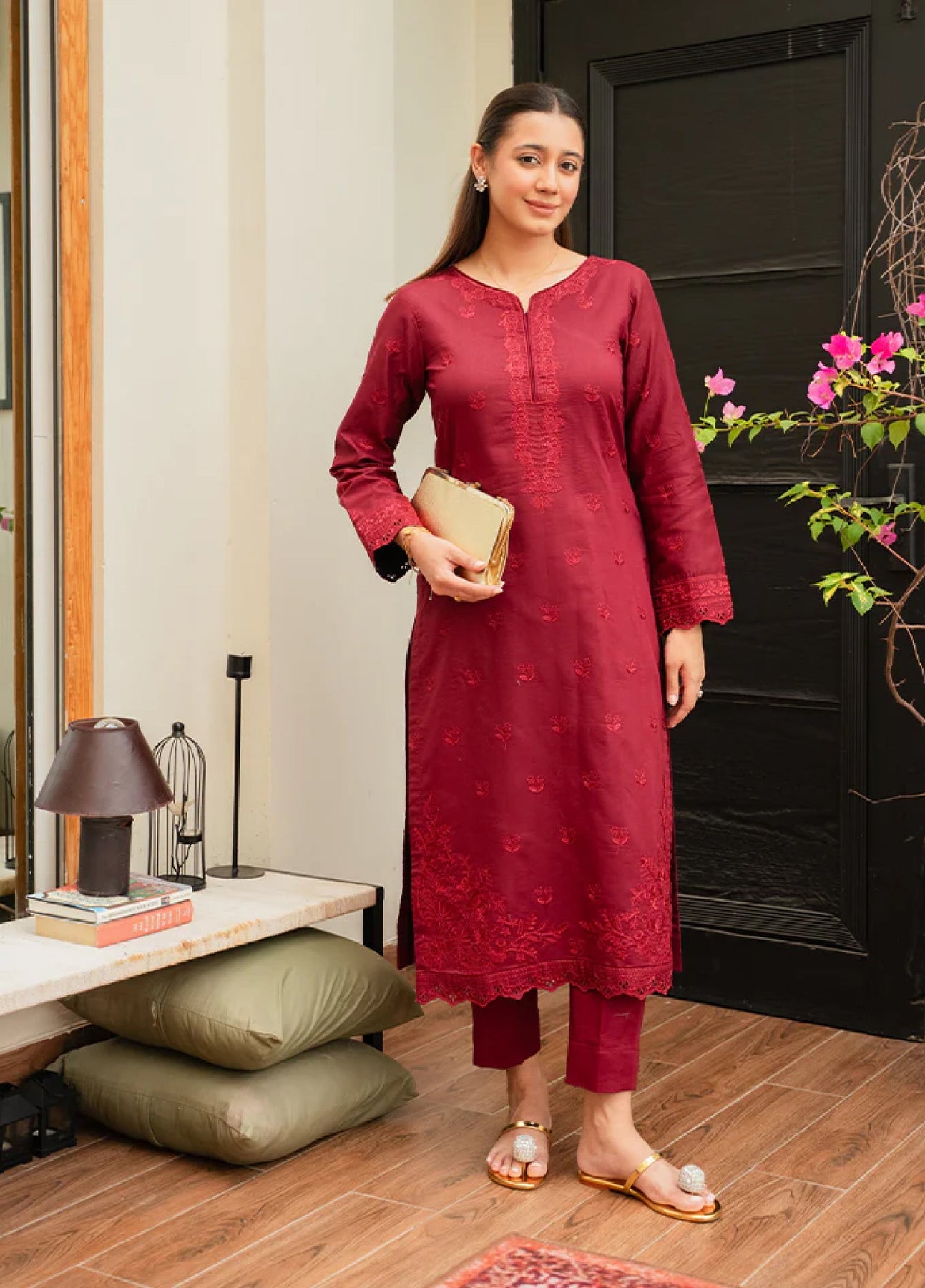 Zyra is a striking two-piece set in a bold red base, crafted from premium lawn. The shirt is beautifully embroidered, exuding timeless elegance, while the embroidered lawn borders on the front and sleeves add refined detail. Paired with a complementing cotton trouser, Zyra is a perfect balance of vibrance and sophistication, making it an essential addition to your wardrobe.