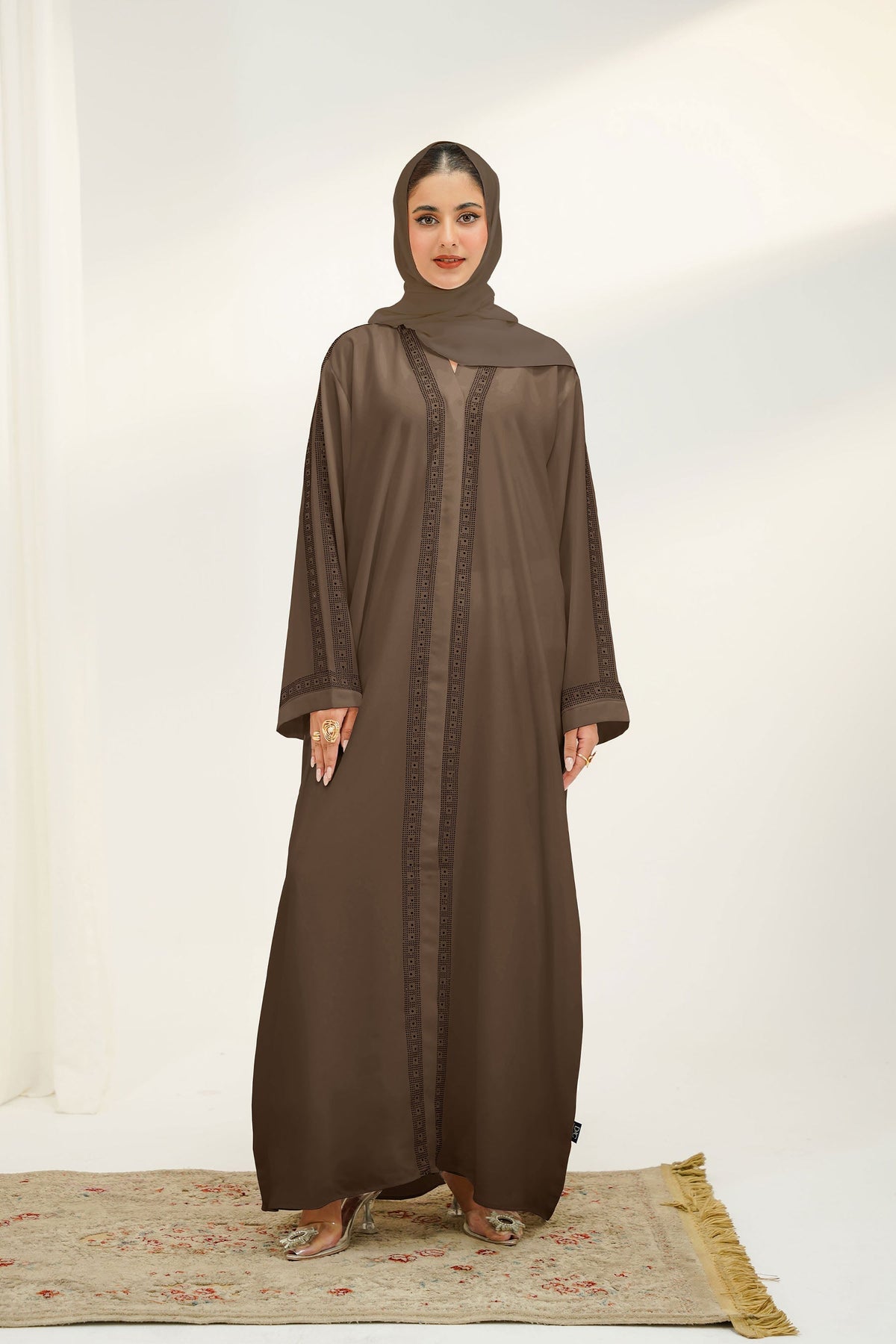 Design: This abaya features a straight-cut silhouette with intricate diamantes along the front open panel and sleeves, finished with hidden buttons