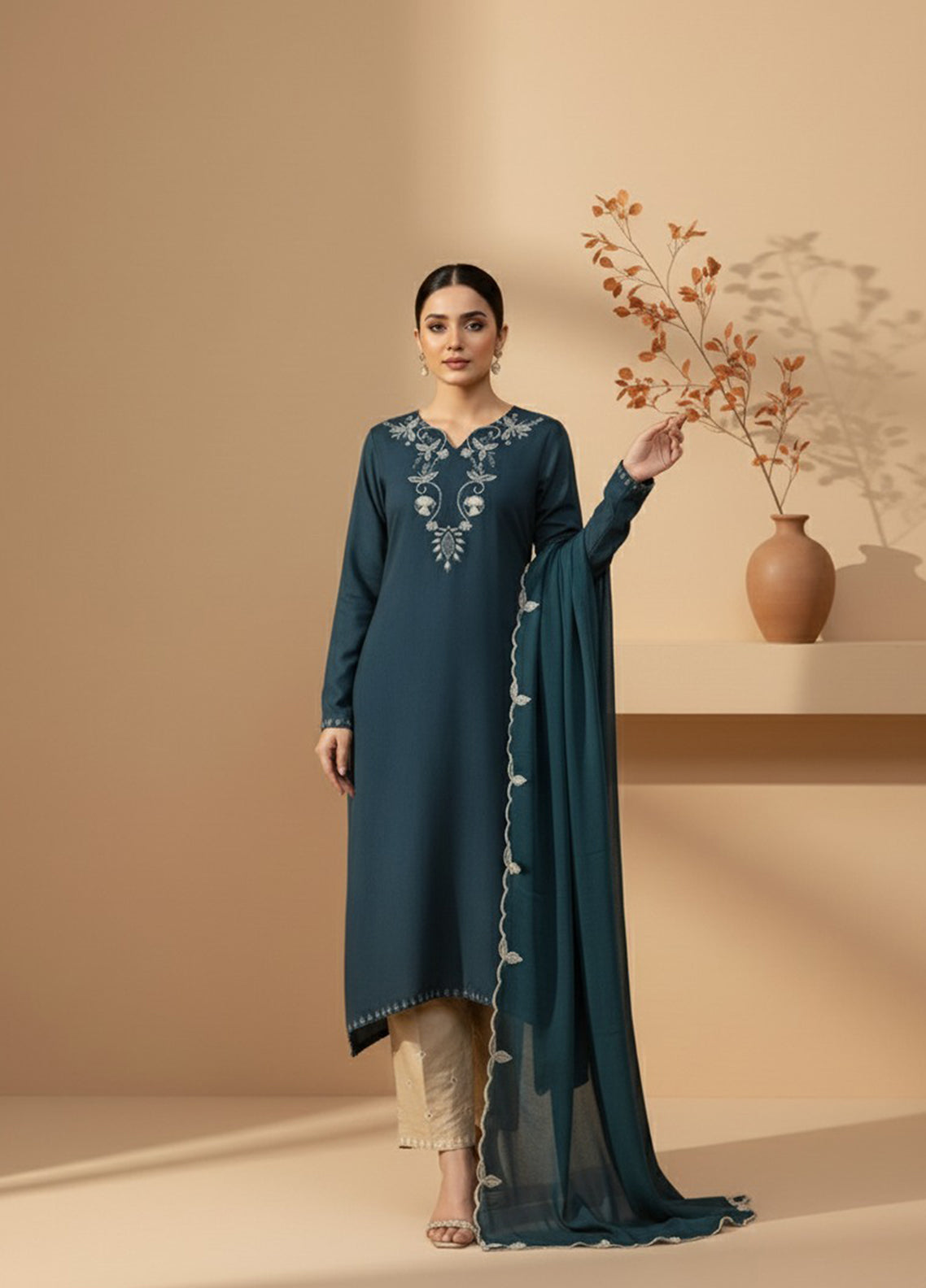 Step into understated luxury with this Raw Silk 3-piece ensemble, designed with elegant craftsmanship and timeless appeal. The shirt features an embroidered neckline alongside delicate detailing on the sleeve borders and hem, creating a beautifully refined silhouette. The look is completed with embroidered trouser borders for a cohesive finish and a medium silk dupatta that adds effortless grace. Perfect for festive gatherings or elevated everyday wear.