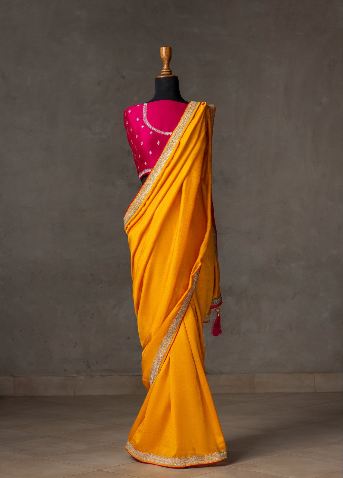 A light weight soft, raw silk unstitched saree with a rich sheen to the fabric. This saree elevates true sophistication and style. Adorned with a thin-edged tilla work and embellished rhinestone border. This includes a contrasting embroidered blouse to complement the saree.