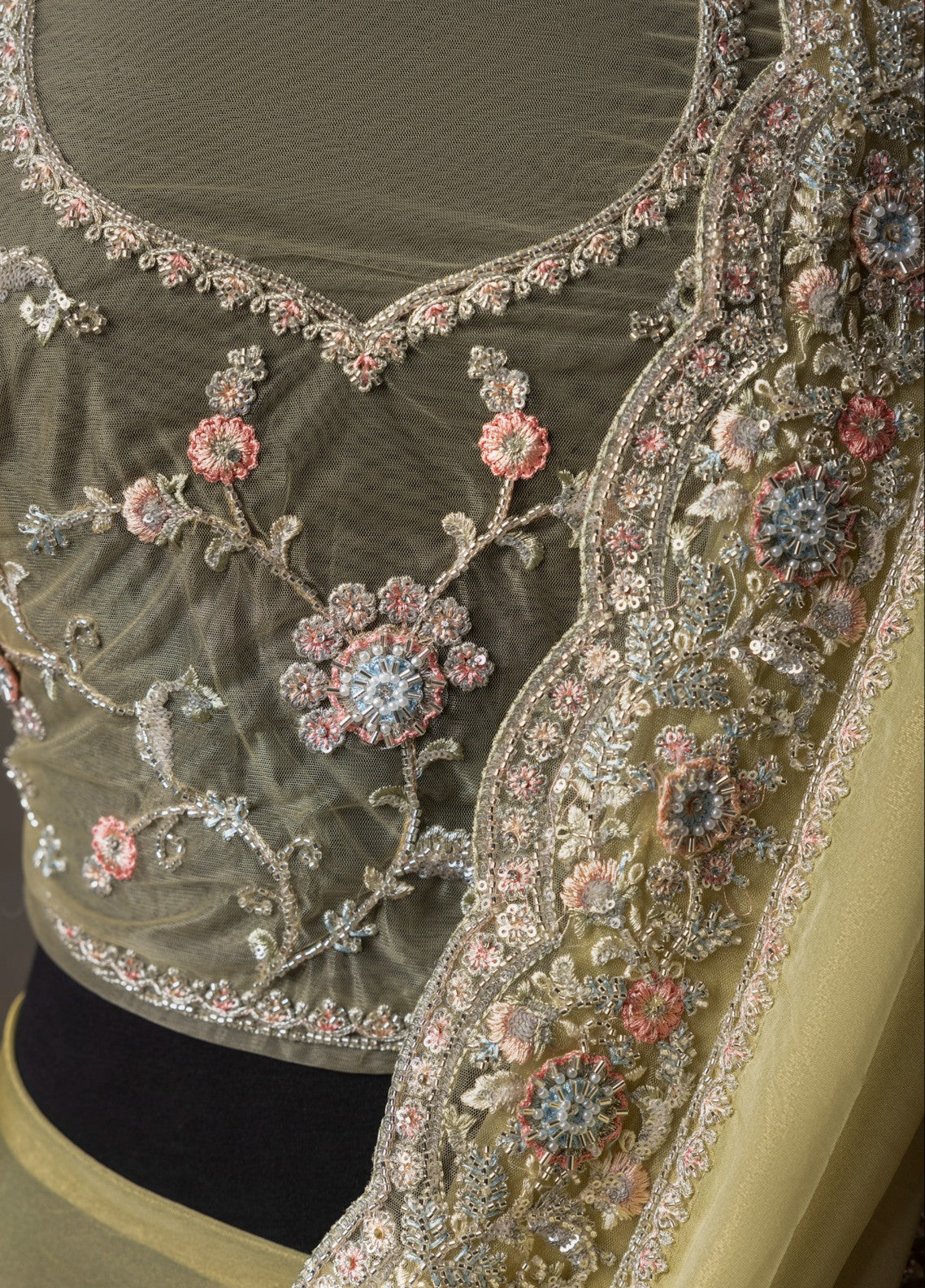 A pale yellow saree in tissue silk with a sheer metallic sheen that catches the light beautifully. This saree features handcrafted intricate embellishments with 3D flowers, resham thread and bead work all along the border and on a net unstitched blouse also.