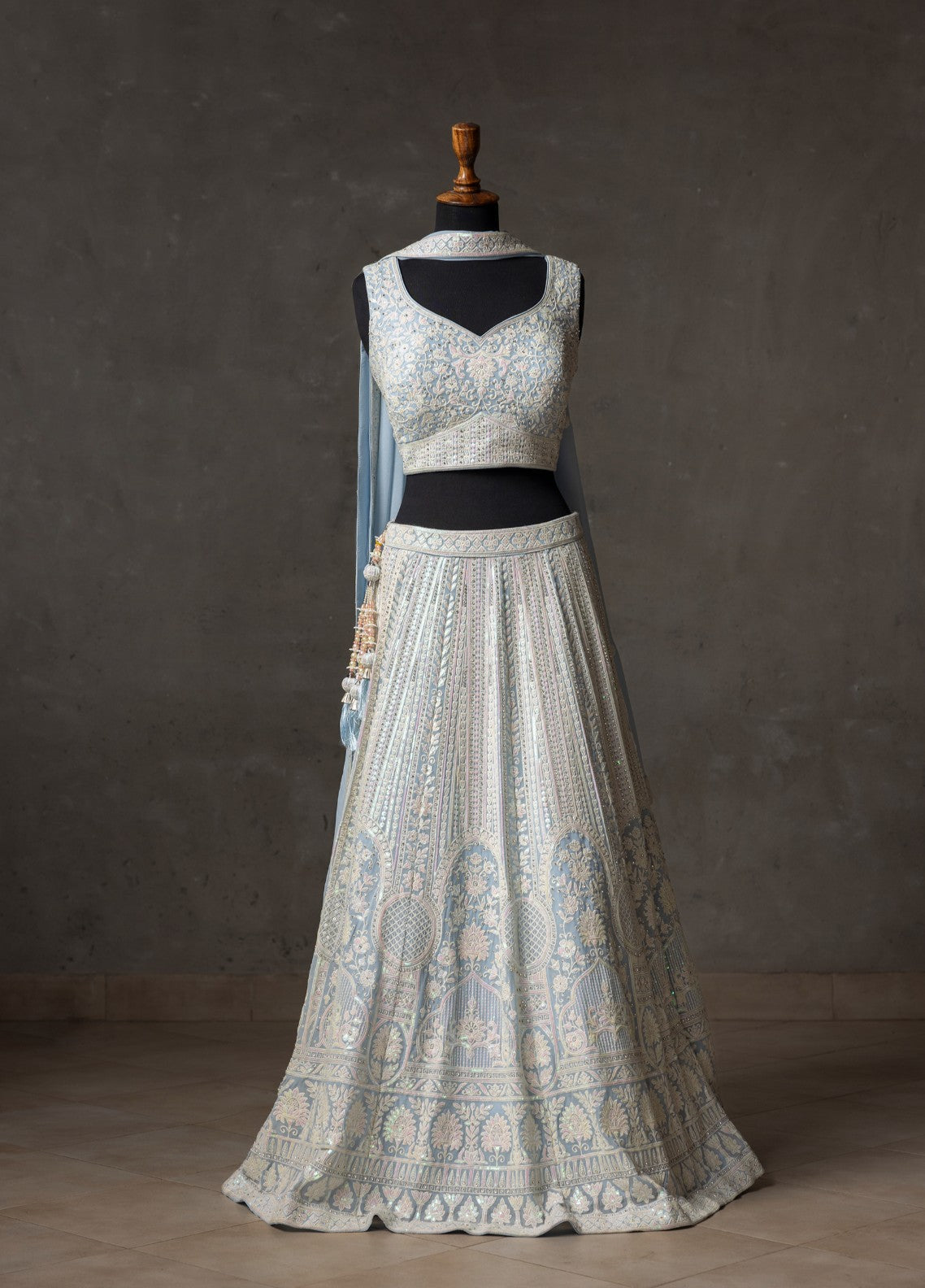 A light blue and ivory stitched lengha set featuring extensive embroidery including lucknowi pearls, cutdana and shimmery sequins. The lengha is an A-line fit in chiffon. This includes an impeccably stitched blouse with embroidery all over. The chiffon dupatta has an embroidered border patch worked all along
