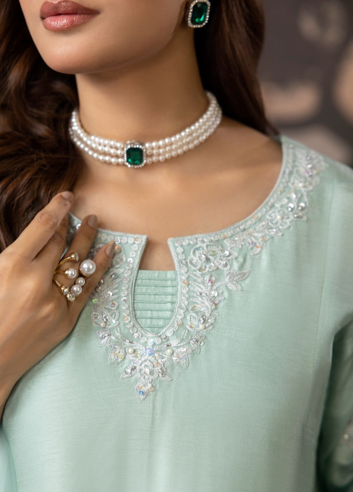 Short-length shirt with front panels, machine embroidery layered with hand touching work, pintex details, and a round neckline. Full sleeves with embroidered bunches, body-fit silhouette, paired with trousers and an organza dupatta detailed with lace along the side paltawa.