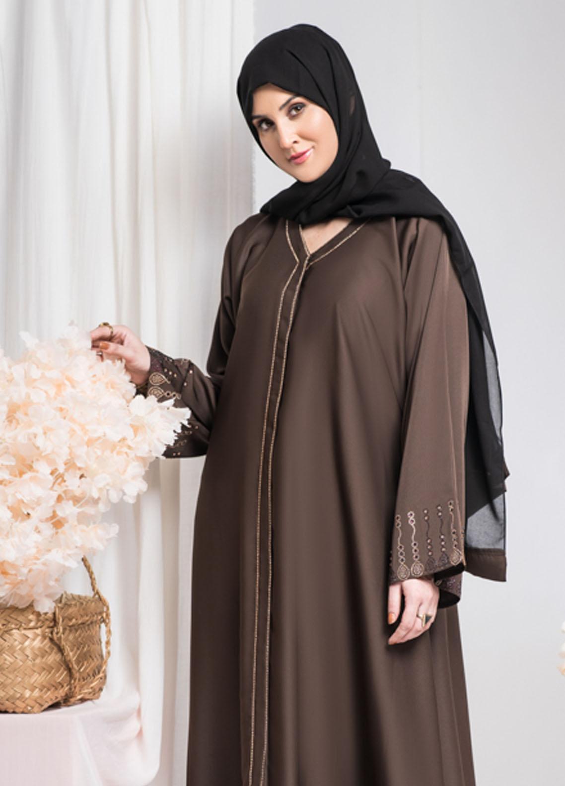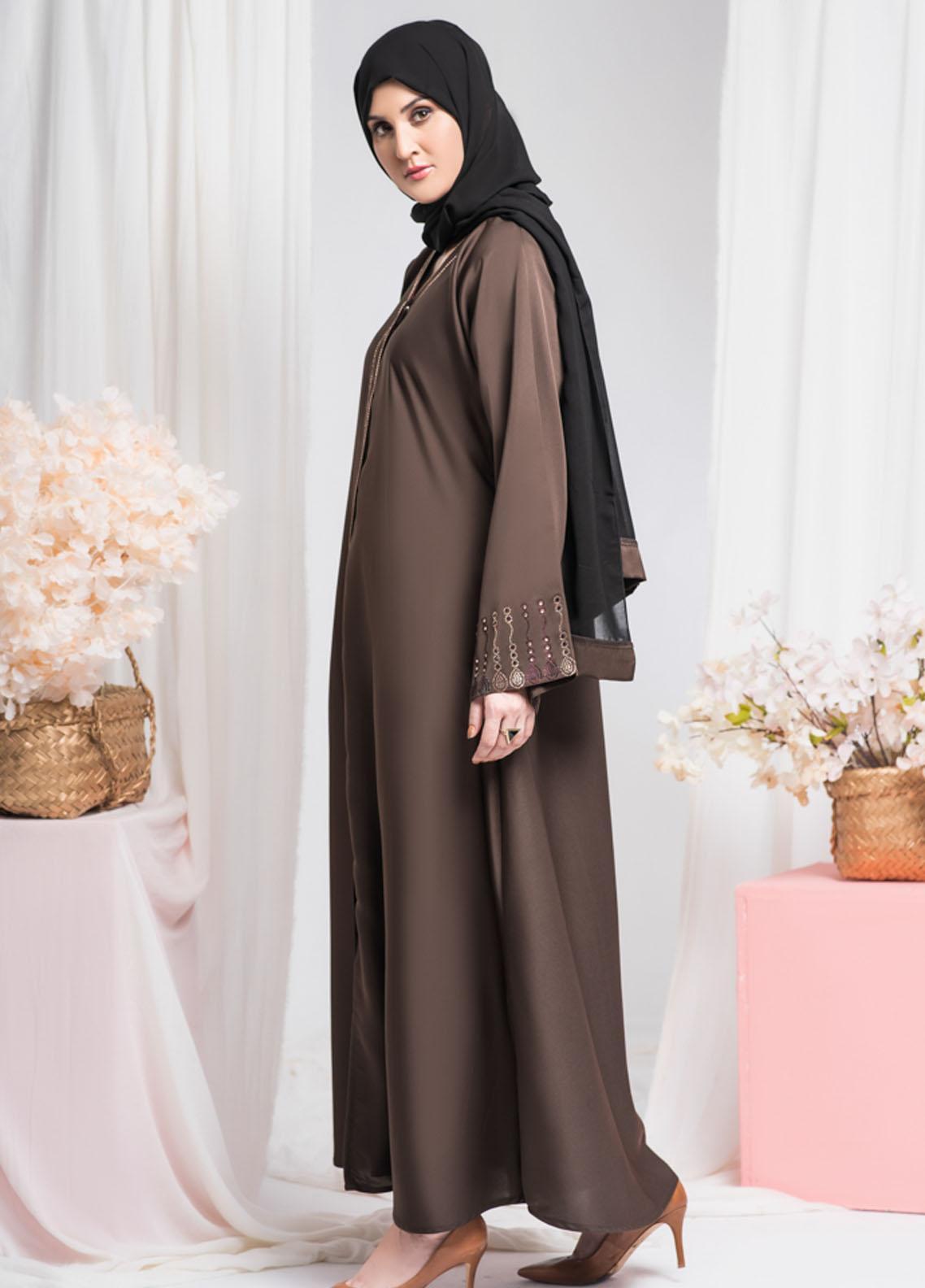 Beautiful Brown with Embroidery occasion wear abaya is designed in soft and breathable summary Nidah fabric with beautiful stunning embroidery at Sleeves making it super elegant chiffon hijab is included Fabric NIDAH Care 30 C Mild Wash Do Not Bleach Do Not Bleach Do Not Tumble Dry Cool Iron Professional DryClean
