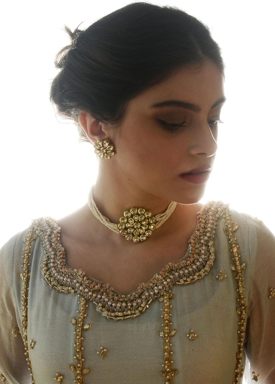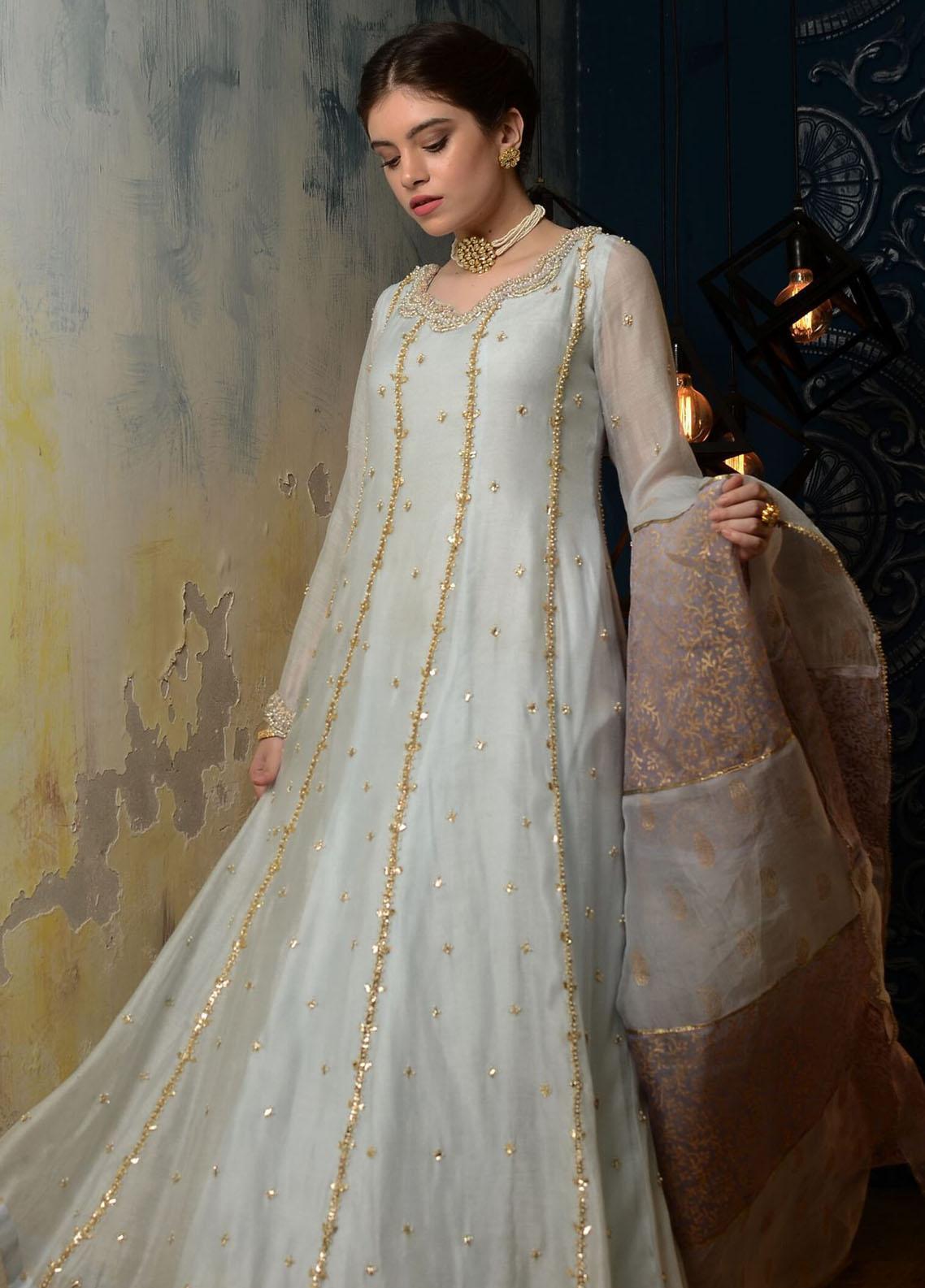Taking You To The Historical Side Of Lakhnawi Era Anarkali And The Heritage Gota Work On This Powder Blue Silk Khaddi Net Attire Paired With Two Toned Lilac And Blue Gold Painted Organza Dupatta