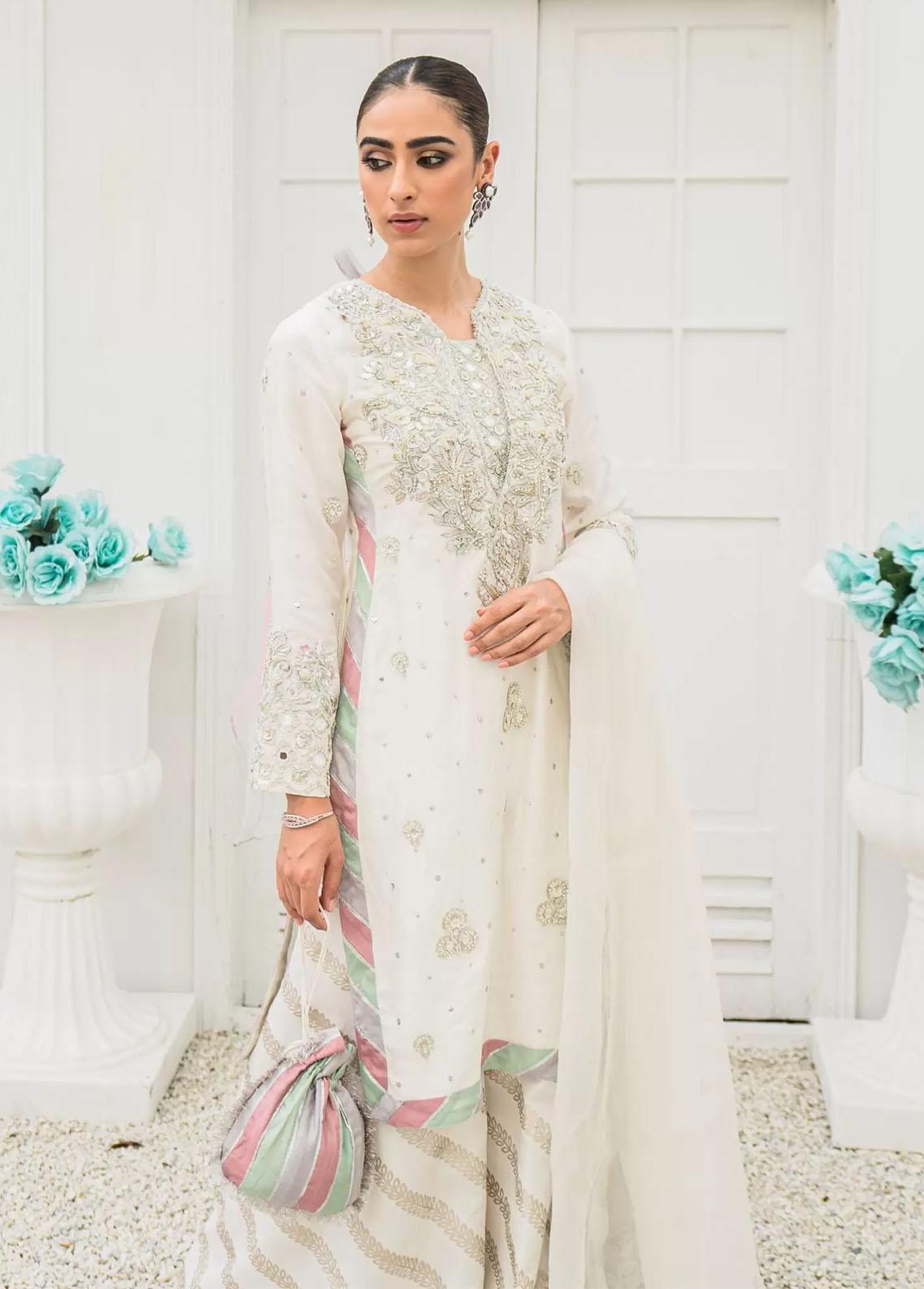 Rania White Is The Favourite One All Made With Love. A Blend Of Traditional Silver Dabka Naqshi Gota And Sheesha Work On Neckline And Motives On Front Is Used With Flawless Techniques, The Side Seam And Hemline Is Done With Pastel Hues Of Chattapatti Which Creates More Power To The Ensemble. Bringing The Sexy Back With A Traditional Way A Round Sheesha Worked Back Cut Tying Up With Ombre Organza. We Have Paired This With A Fused Silver Block Painted Sharara And Intricate Applique Worked Organza Dupatta.