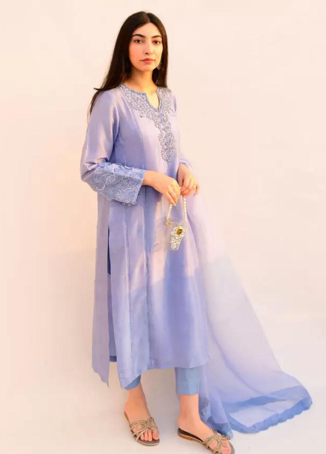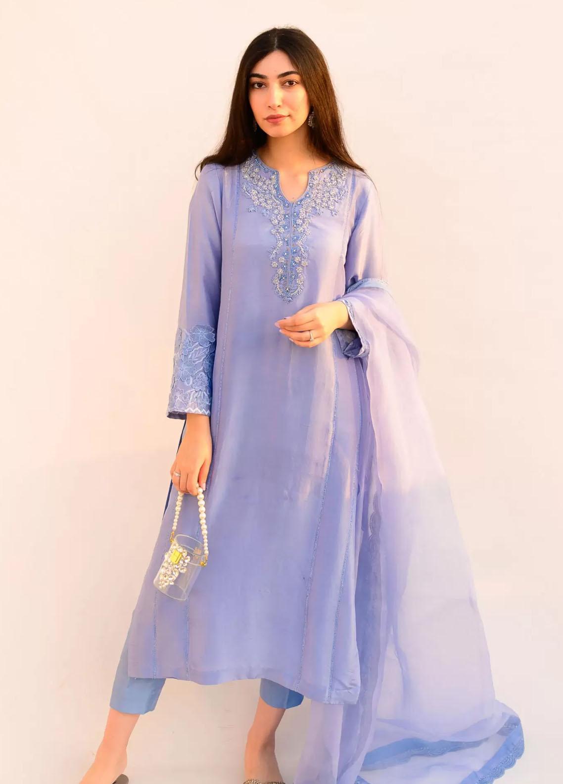 Birdy Blue Is A Beautiful Sandy Blue Coloured Raw silk Outfit With All Delicate Resham Crystals And Swarosvkis Worked Neckline And 3D Flowers And Self Embroidery On Sleeves We Have Paired This Shirt With Straight Trouser And Organza Dupatta