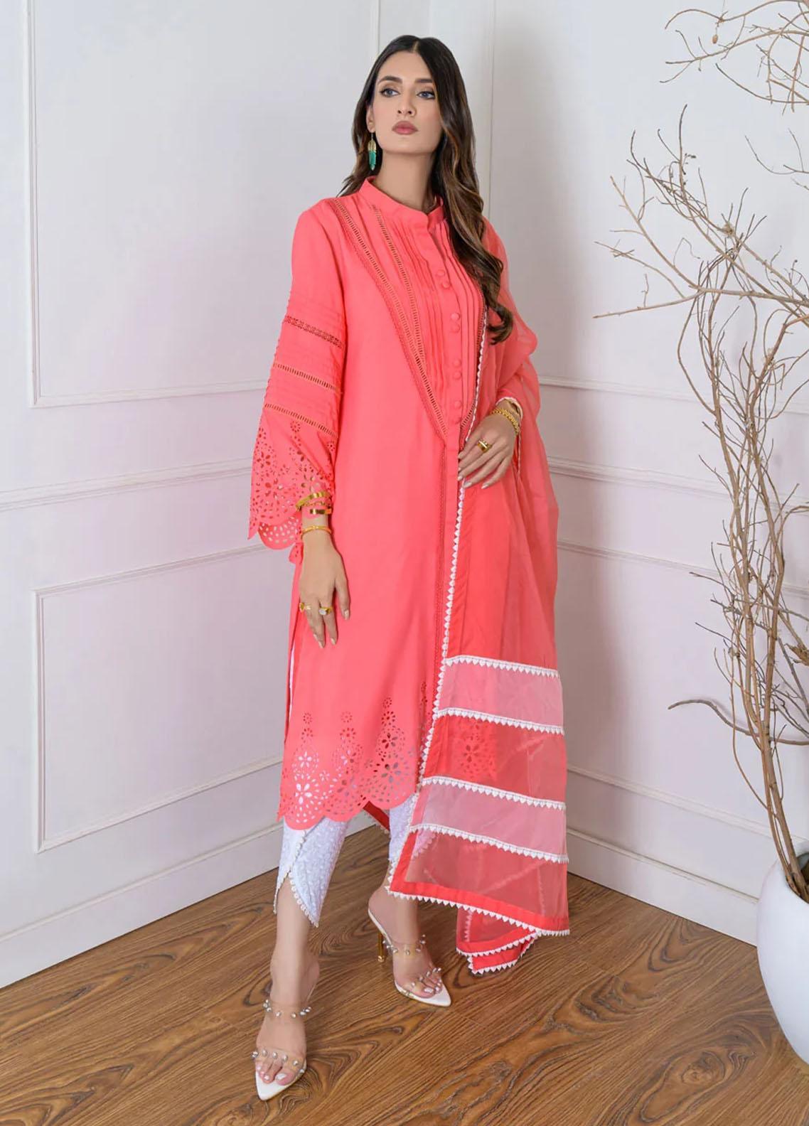 Epitomize grace with our pink attire This beautiful ensemble is enhanced using appliques laces The shirt has a delicate cutwork border with lace and button detail all over including sleeves paired with cotton chicken tulip shalwar with lace detail It also comes with organza dupatta with beautiful applique lace detailing Model is wearing size small is 5 8 tall