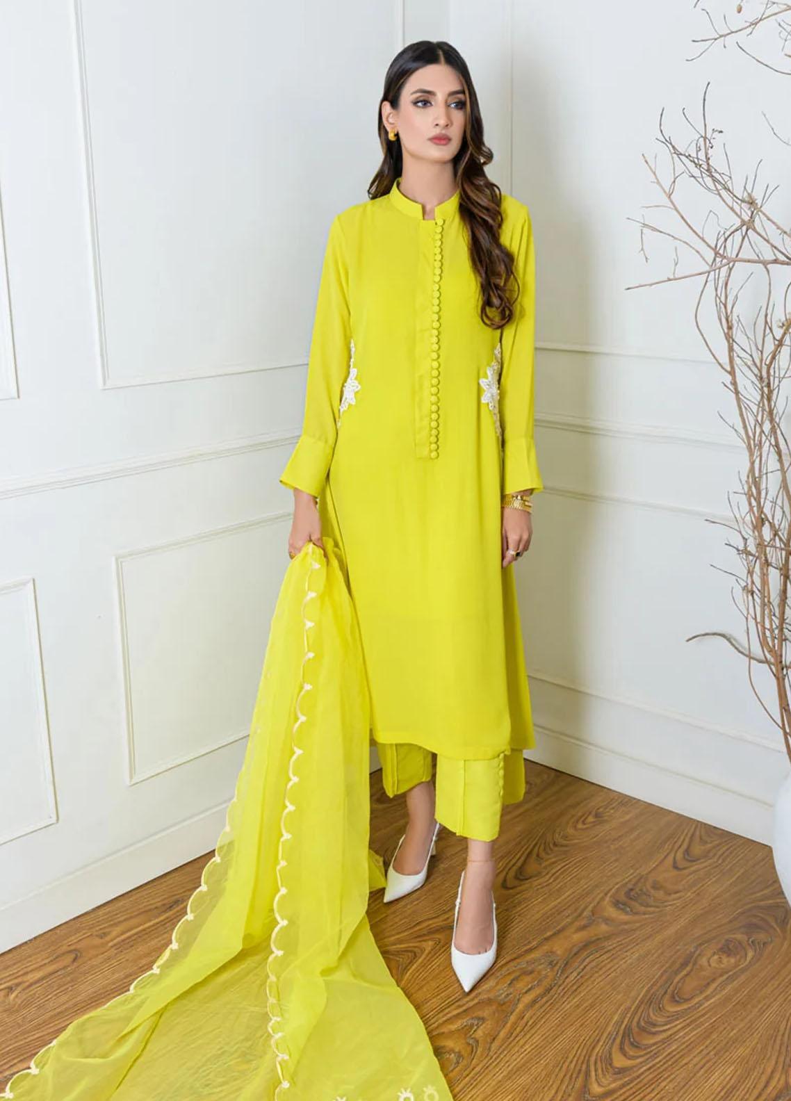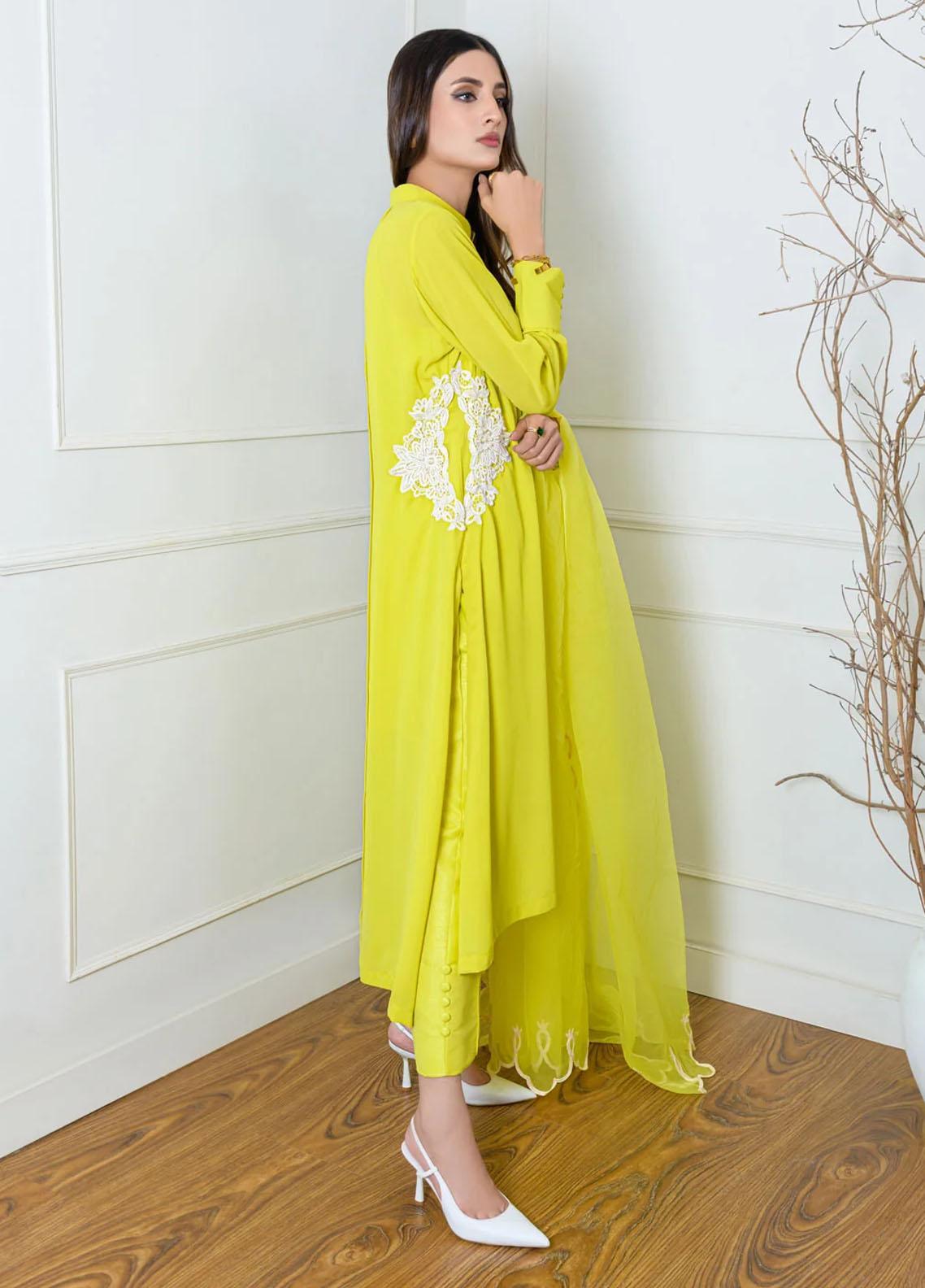 This uber flattering A line shirt is decorated with buttons all over the neckline and sleeves Paired with a coordinating organza dupatta with cutwork detail all over Complete your ensemble with our raw silk pleated pants with button detail Model is wearing small size is 5 8 tall
