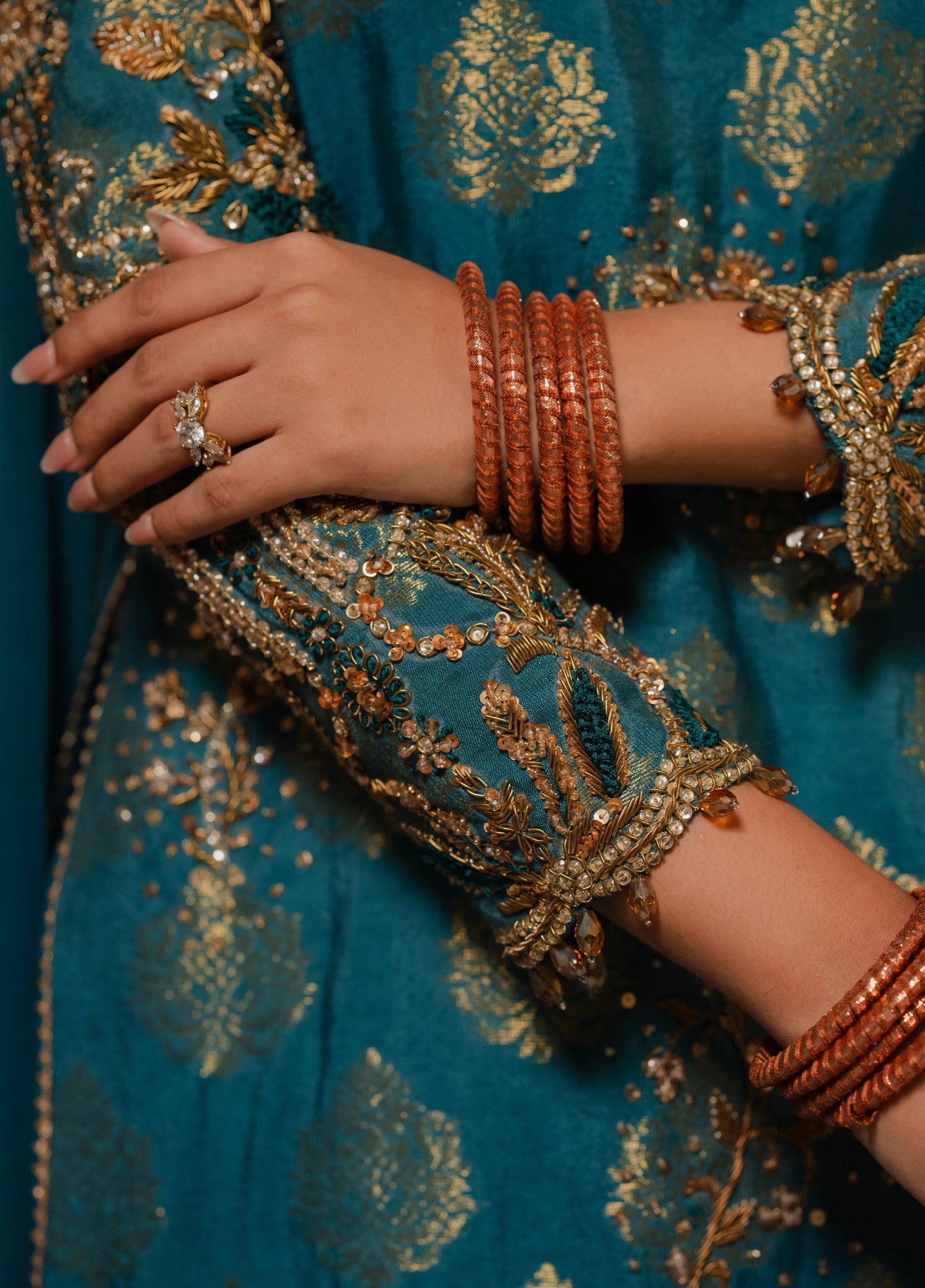 LIA - Festive Formal - VOL 3: A Teal blue ensemble shimmering with artisanal finesse. A banarsi khaddi shirt, cut in a timeless straight A-line silhouette with high side slits, is lavishly embroidered with zardoze, sequins, resham, crystals hand work, finished with gota. Paired with tailored Korean rawsilk floor length izaar. The teal blue airy net dupatta, adorned with butterfly motif in the centre and pleated as choker dupatta, drapes like a whisper of regality.