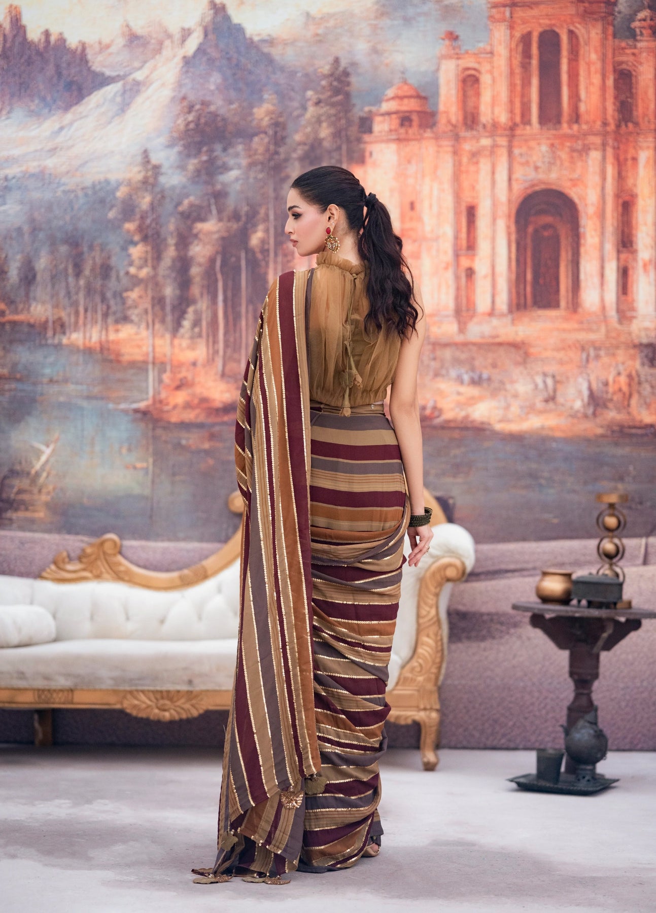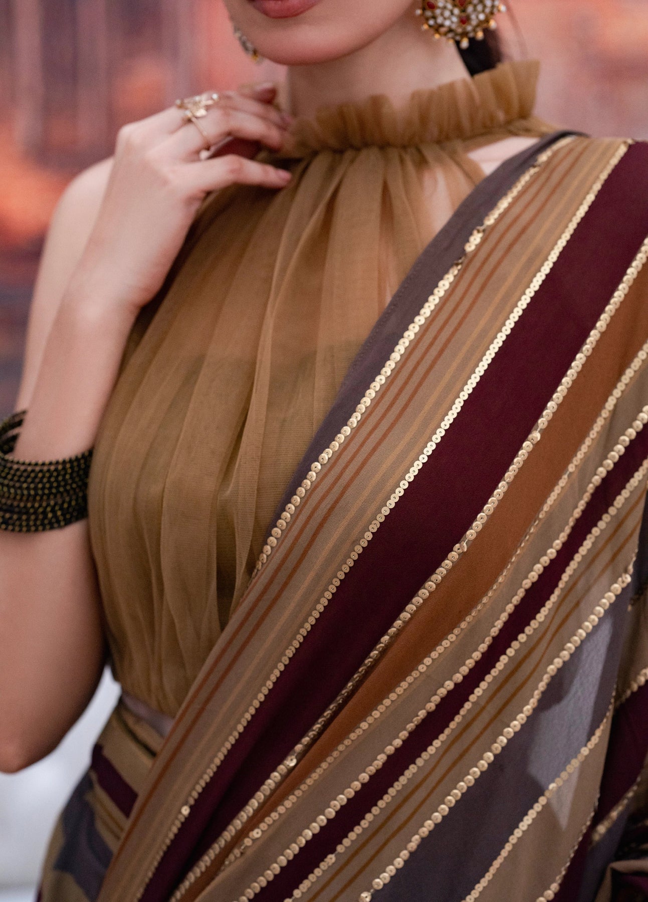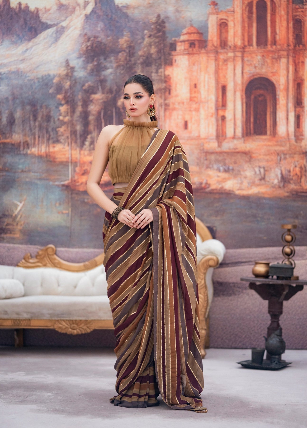 LIA - Festive Formal - VOL 3: A whisper of ethereal romance, this sari is crafted from digitally printed georgette chiffon, washed in the deep earthy hues. The halterneck blouse in net tailored with pleats and frill neck and 3D embellished tassels cascading down the back. Draped in translucent printed stripes over a printed skirt, the sari is finished with zardoze handwork butterfly tassels and delicate sequins hand embroidery along the pallu. The silhouette moves with modern grace while holding a timeless soul.