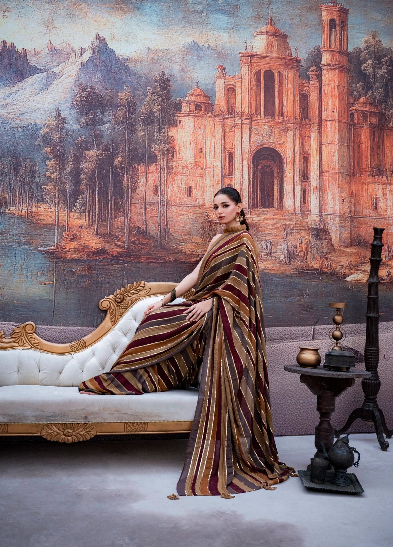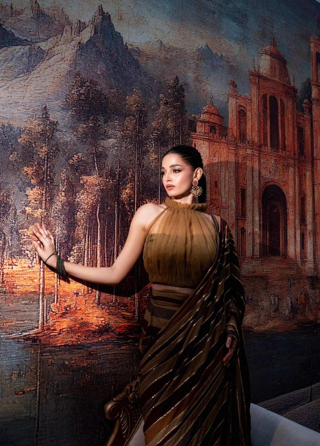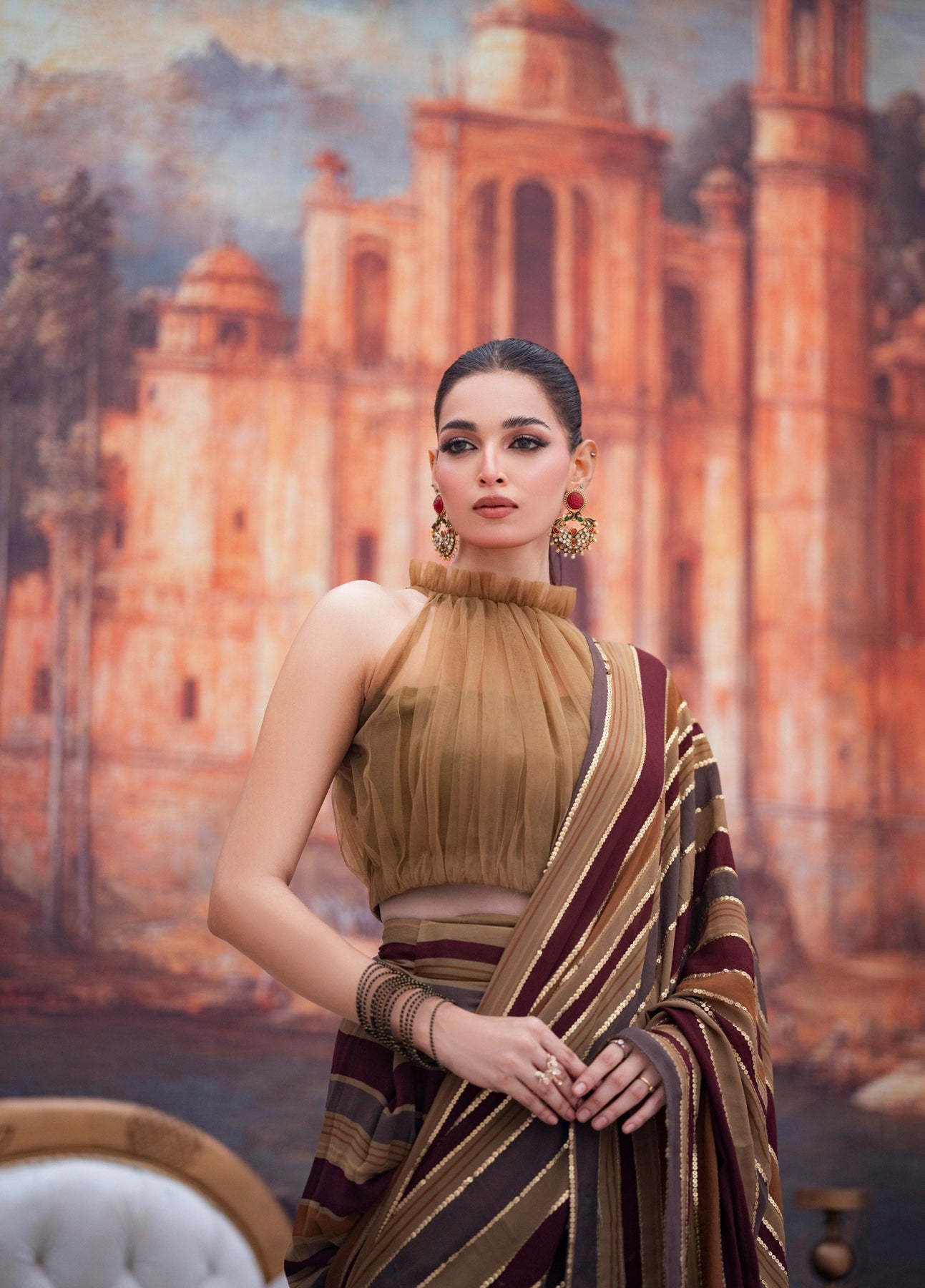 LIA - Festive Formal - VOL 3: A whisper of ethereal romance, this sari is crafted from digitally printed georgette chiffon, washed in the deep earthy hues. The halterneck blouse in net tailored with pleats and frill neck and 3D embellished tassels cascading down the back. Draped in translucent printed stripes over a printed skirt, the sari is finished with zardoze handwork butterfly tassels and delicate sequins hand embroidery along the pallu. The silhouette moves with modern grace while holding a timeless soul.