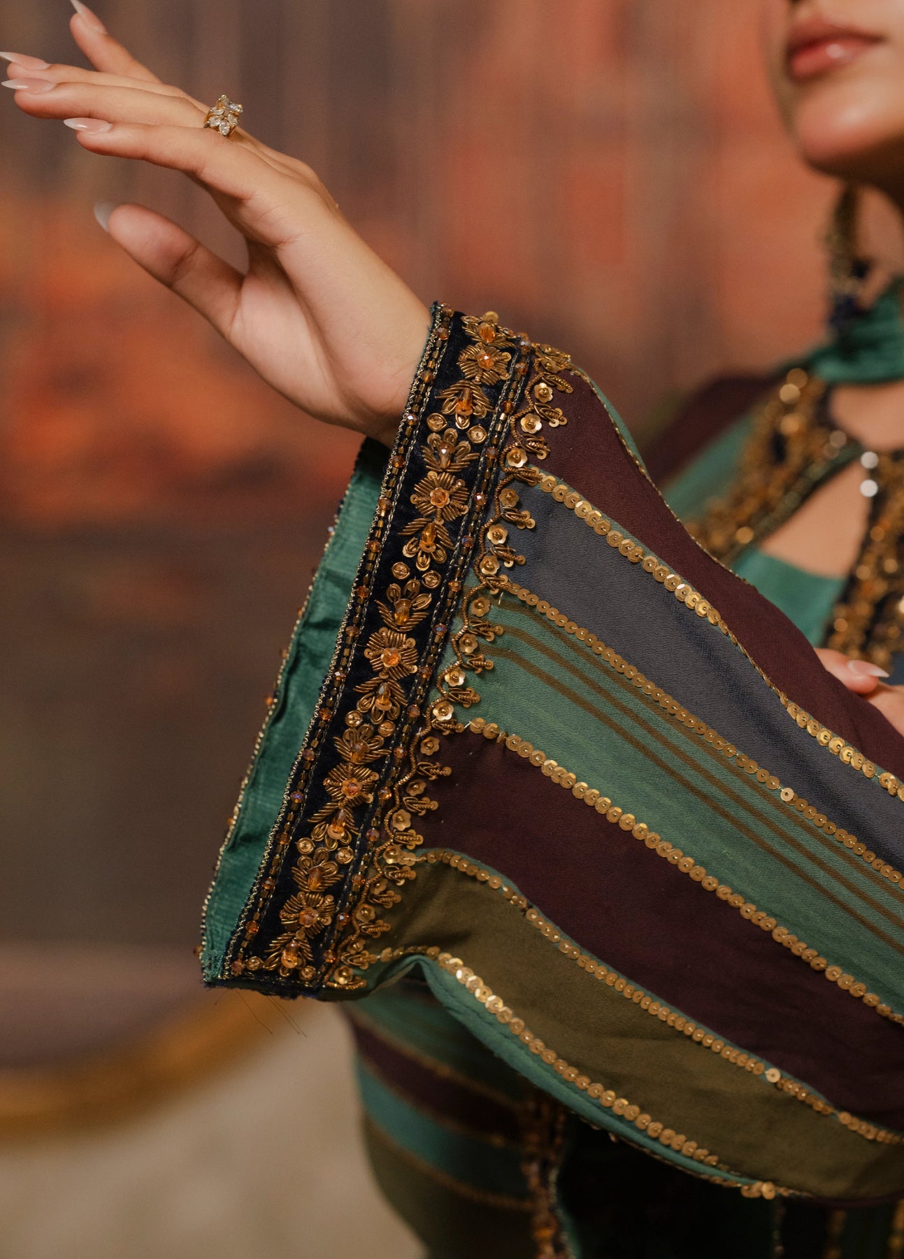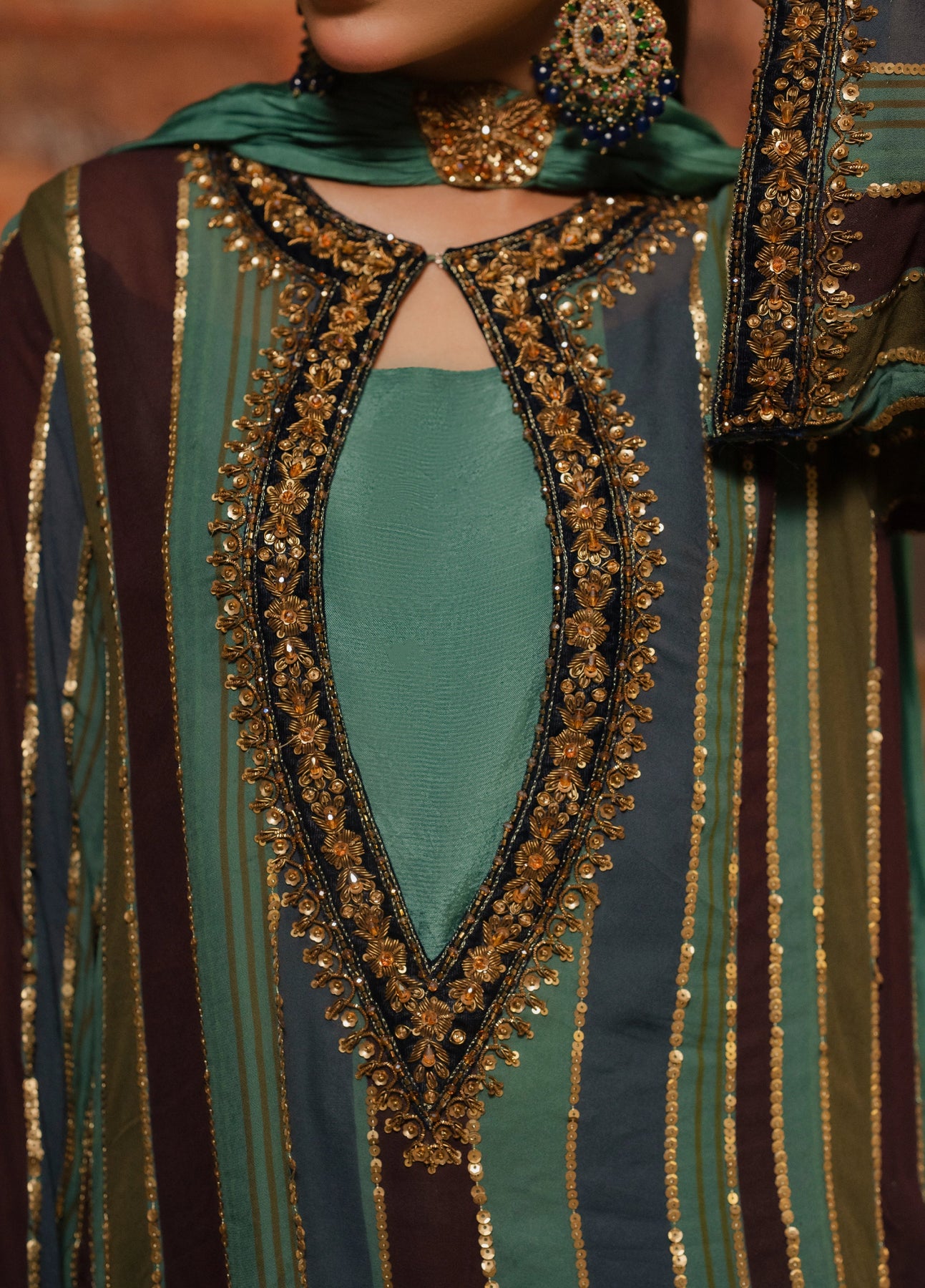 LIA - Festive Formal - VOL 3: The ensemble features a digital printed straight long shirt exquisitely adorned with zardoze and sequins embroidery all over. Features navy blue appliquéd velvet accent neckline and sleeves hem, the keyhole shaped contrasting neckline and sleeves are embellished with sequin and zardoze handwork embroidery. Pearl and bead finishings. Paired with Bamboo raw silk floor length culottes and under shirt. Paired with tailored medium silk butterfly choker neck dupatta. Exudes an air of effortless elegance, making it the perfect choice for any occasion.