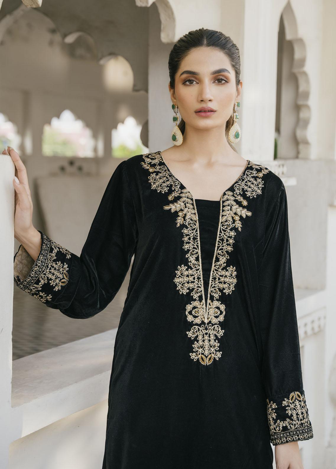 Fabric Its 9000 micro velvet Details Tilla embroidered neckline with embroidered sleeves with modren cut front while paired with jamawar pants Length length is 48-50 for all sizes